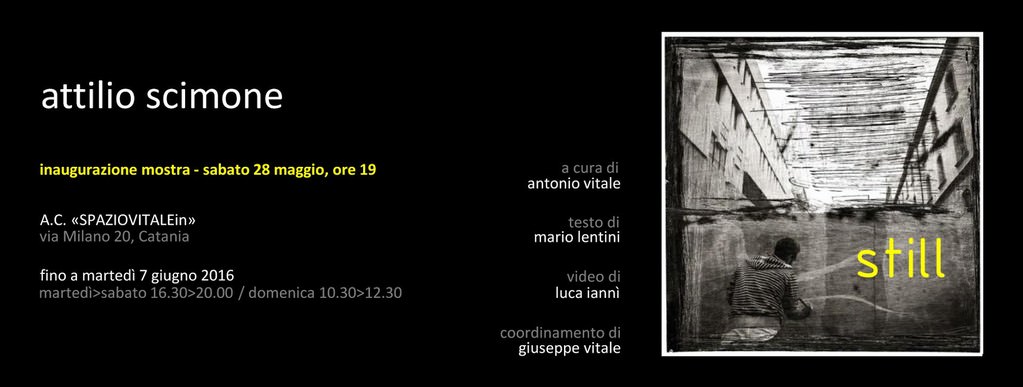 La mostra personale di Attilio Scimone allo SPAZIOVITALEin di Catania dal titolo “Still” a cura di Antonio Vitale, con testo critico di Mario Lentini, video di Luca Iannì ed il coordinamento di Giuseppe Vitale segue l’esposizione di Nuccio Squillaci dal titolo “Il funambolo del possibile”.
