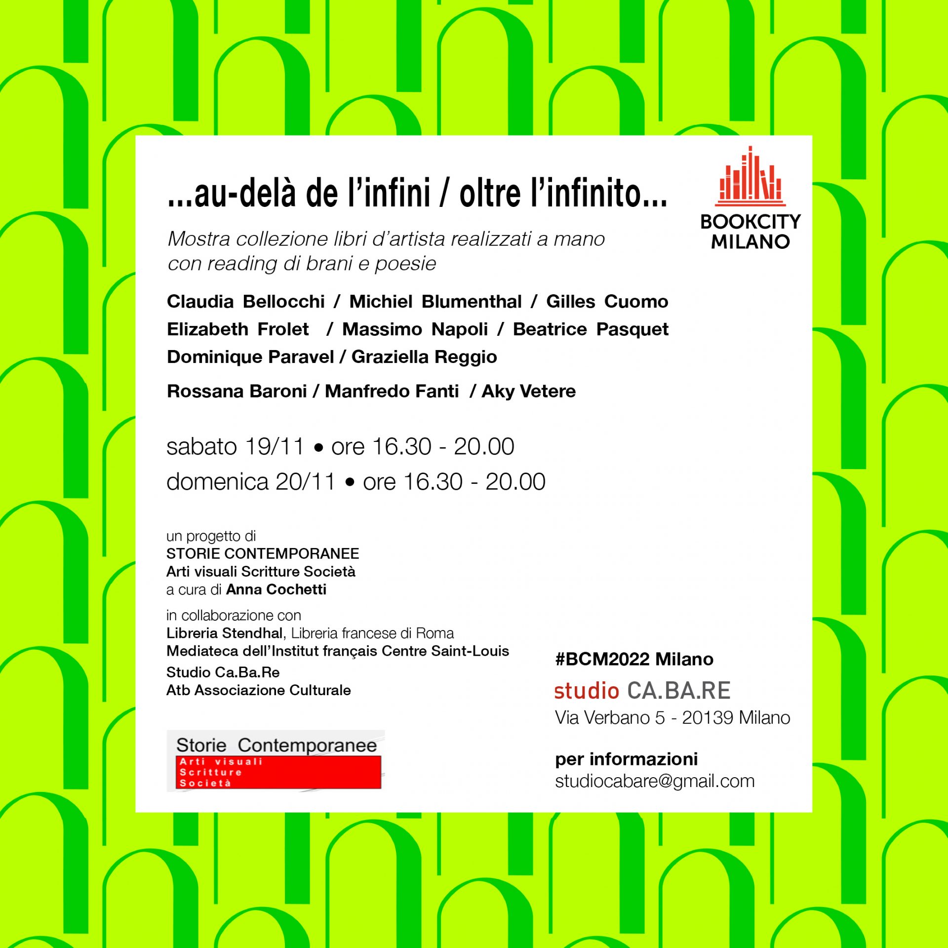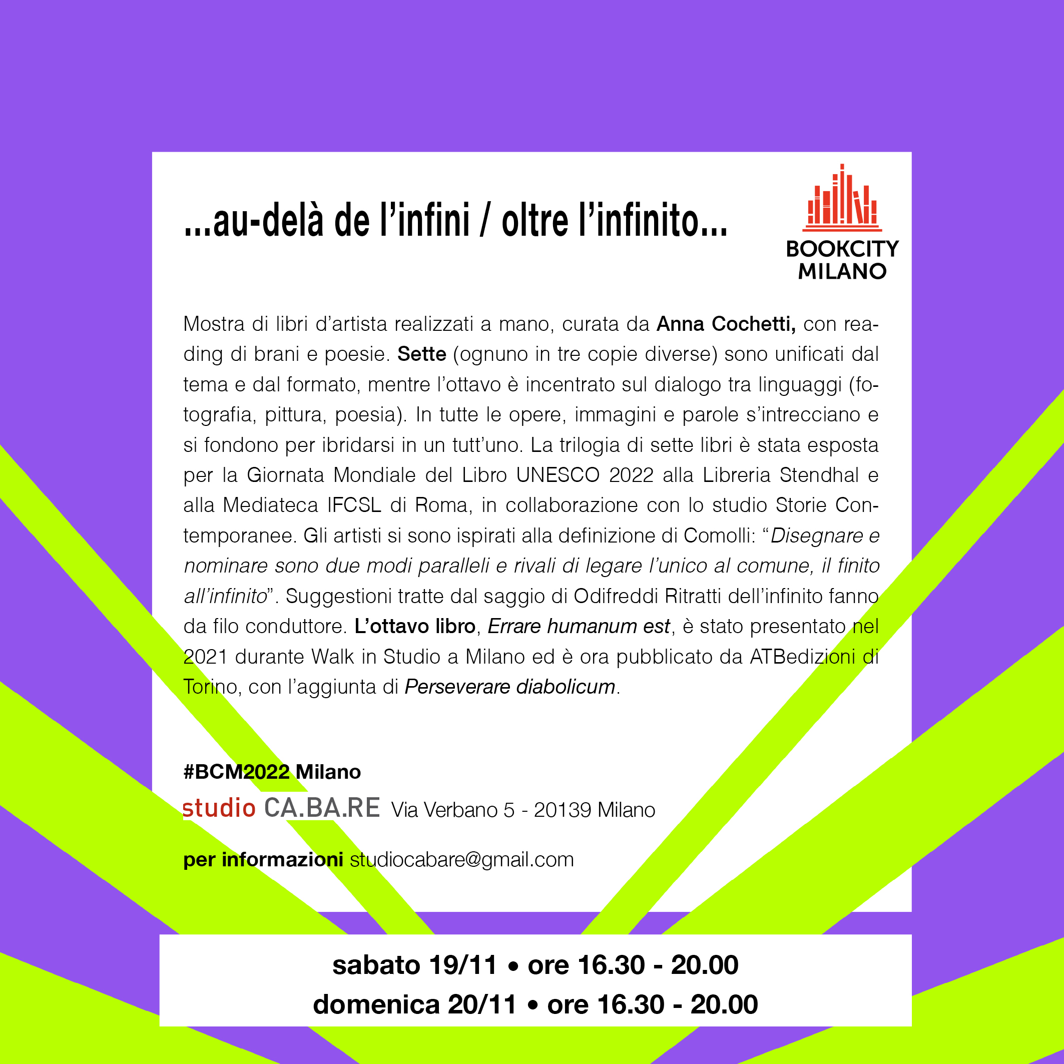 Per Bookcity 2022, una mostra di libri d’artista, realizzati a mano, con reading di brani e poesie. Immagini e parole s’intrecciano e si fondono in un tutt’uno. Sette libri, ognuno in tre copie diverse, sono unificati dal tema e dal formato, mentre l’ottavo è incentrato sul dialogo tra le arti.