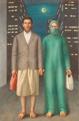 Bulzatti ha da sempre privilegiato lo sguardo analitico verso le situazioni di intimità tra gli esseri umani: siano uomini o donne sole, come pure coppie, i suoi personaggi abitano un mondo apparentemente lontano dai turbamenti della quotidianità: hanno in comune una posa ieratica, rafforzata da una sostanziale frontalità e dallo sguardo lontano, mai diretto verso lo spettatore e pertanto appartenente più alla categoria dell’immortale che dell’umano. Anche le nature morte e i paesaggi rispondono alla medesima logica: si tratta di immagini idealizzanti, di paesaggi mentali che abitano la fantasia e il sogno e che appaiono come teatro privilegiato per una nuova generazione di personaggi “esotici”, ultima piacevole sorpresa del lavoro di Aurelio Bulzatti.