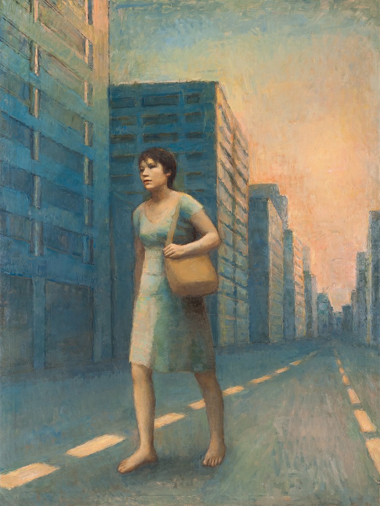 donna che da sola percorre la strada di uno dei dipinti della mostra. Appartengono a