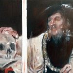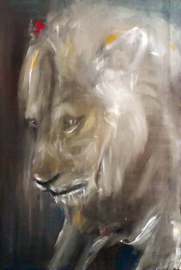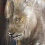L’uomo e la bestia si confondono, si mescolano, si contendono la scena. Entrambi condividono uno stesso dentino e una stessa sensibilità con l’unica differenza che non I’habitat animale, ma la casa dell’uomo, come un cancro, si e moltiplicata a dismisura fagocitando territori della mente. L’occhio dell’animale dell’uomo sono come persi nel vuoto. L’espressione è quasi interrogativa e stimola l’osservatore a porsi delle domande. I personaggi é come se entrassero improvvisamente nella tela del pittore. Sembrano catturati nel corso di una sequenza cinematografica. Le figure, dai contorni volutamente più o meno incerti, come fotografie mosse azionano il desiderio di capire a quale storia appartenga il frame proposto. È un pasto appena consumato, come il quadro del leone che si muove sovrastando la città? È la fuga da un fantomatico zoo, come il ritratto dello scimpanzé?
