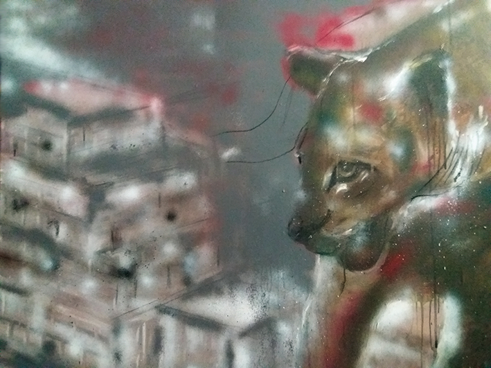 L’habitat artificiale dell’uomo, per Aurelio Gravina, ha il carattere della giungla. Bestie più o meno feroci si tra le case e sovrastano panoramiche cementificate. Forse non sono lì in perlustrazione, forse smarrite o cacciatrici in nuovi territori, forse sono solo metafora dell’uomo snaturato.