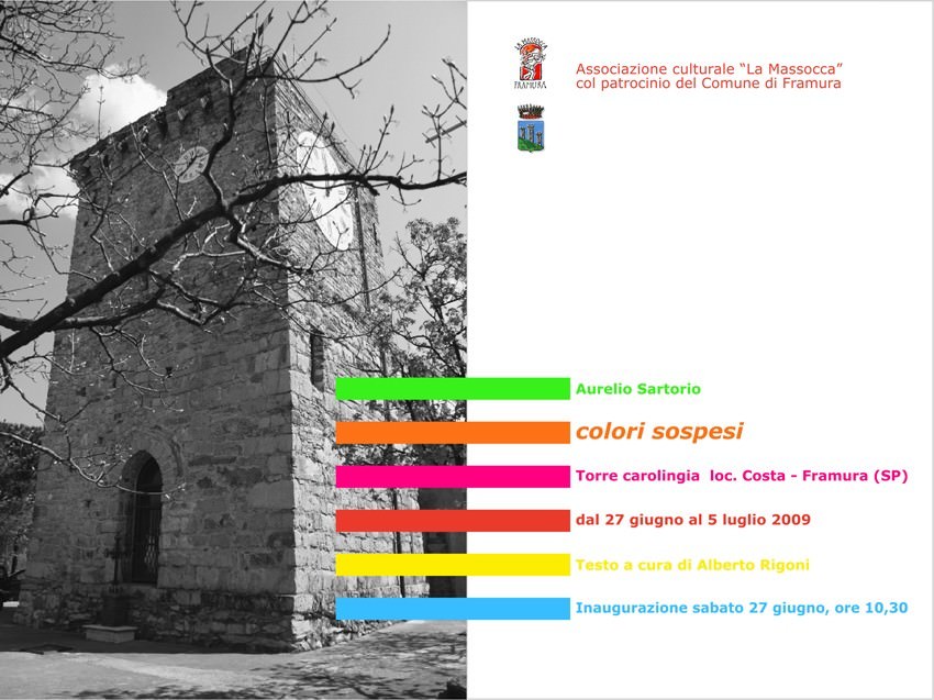 La mostra di Framura è un passo ulteriore su questa strada. La questione che la Torre Carolingia propone non è da poco: diversamente dall’ambiente naturale del giardino, si tratta di un ambiente artificiale che ha raggiunto un proprio equilibrio, o autosufficienza formale, in più di mille anni, nel corso dei quali è passata dalla funzione di guardia, a quella di possibile protezione nel contesto di mura oggi scomparse, infine a quella di torre campanaria. Aurelio Sartorio ha intuito come la Torre si presti bene non solo come sala espositiva, ovvero luogo dove appoggiare temporaneamente i propri oggetti-quadro (e questo avviene nella prima sala), bensì anche e soprattutto come ambiente su cui intervenire, ovvero superficie su cui applicare colore (e questo avviene nella sala superiore). Ecco ripresentarsi la sfida: rompere un equilibrio iniziale per poi ritrovarlo al termine di un percorso di Pittura. Così, il pittore ha scelto di utilizzare nella prima sala piccole opere recenti, installandole seguendo i suggerimenti del luogo, ovvero i vecchi chiodi già piantati tra le pietre delle pareti; nella sala superiore invece le coloratissime barre di polistirene sono sospese su, poco visibili, binari di nylon grigio agganciati a preesistenti barre d’acciaio. L’artista modifica così la percezione che lo spettatore aveva della parete della Torre, ce ne dà una lettura nuova ma non ne stravolge l’essenza. Ecco la sua proposta per questa mostra. Che lo spettatore la accolga o la respinga, nei suoi occhi resteranno in ogni caso almeno due dati, cioè la parete di pietre di cava e gli sgargianti blocchi di polistirene: ovvero resterà un’idea di superficie, un’idea di colore e un’idea di come il colore è stato messo in relazione con la superficie e lo spazio. Per un pittore questo basta, e la missione può dirsi compiuta.