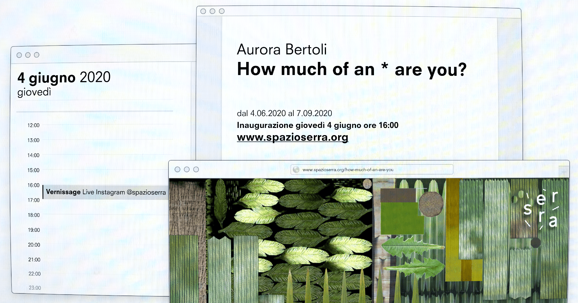 spazioSERRA è un non-luogo in cui l’arte dei giovani artisti si manifesta come un incidente di percorso. Fisicamente è situato all’interno del Passante Ferroviario di Lancetti, ma non ha un indirizzo proprio e sembra non appartenere a nessuna carta geografica. Uno degli obiettivi dello spazio è quello di spostare questa caratteristica in un’altra realtà, quella virtuale. Vista l’emergenza sanitaria, SERRA anticipa quello che sarebbe stato un dispositivo espositivo della prossima stagione, avviando la prima delle esibizioni digitali con How much of an * are you? di Aurora Bertoli. L’artista, diplomata in Pittura all’Accademia di Belle Arti di Brera di Milano e laureanda in Arti Visive allo IUAV di Venezia, sviluppa la sua prima mostra personale nel sito internet di spazioSERRA.