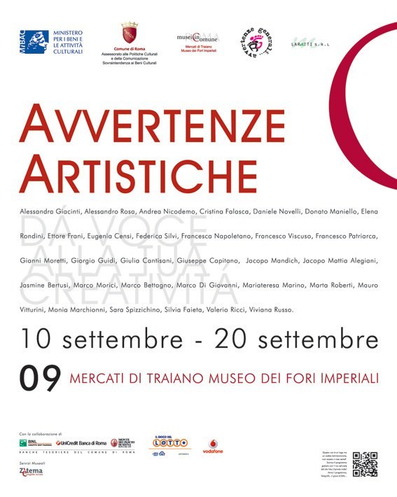 Giovedì 10 settembre, dalle ore 17 presso i Mercati di Traiano Museo dei Fori Imperiali si conclude la fase dedicata all’arte dal progetto “Avvertenze Generali”, dedicato a giovani artisti tra i 18 e i 35 anni e realizzato grazie al contributo del MIBAC e la collaborazione del Comune di Roma Assessorato alle Politiche Culturali Sovraintendenza ai Beni Culturali. Un luogo magico, importate, rappresentativo, dove i nuovi artisti, grazie alla sensibilità del Sovraintendente ai Beni Culturali di Roma Umberto Broccoli e all’interessamento del Sottosegretario alla Cultura Francesco Maria Giro, hanno trovato degna di rappresentatività.