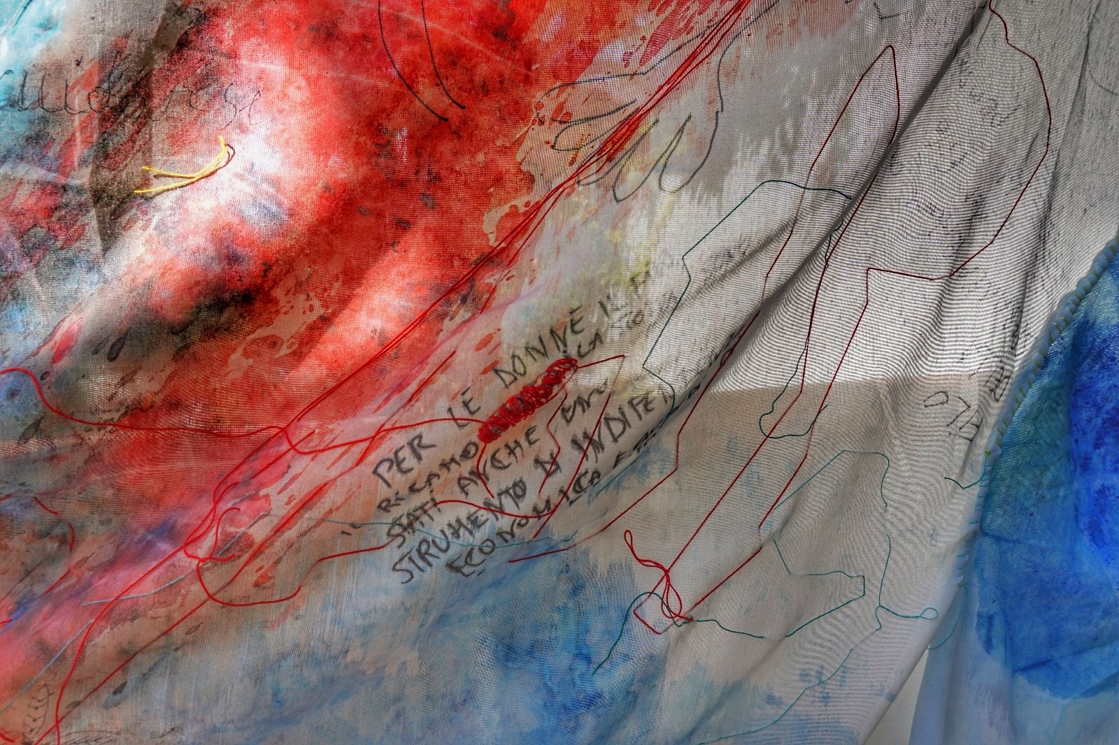 Rammendare vuoti. È il titolo dell’opera di arte relazionale installata all’interno della mostra, a cura di Tere Chad (Cile/Inghilterra) e Rossella Puccio realizzata con ago e filo insieme ad alcune donne: Claudia Quartuccio, Stefania Licata, Mara Cortimiglia, Vittoria Castagna Capritti, Elvira Rotigliano, e Stella Amato e quelle dell’UDIPALERMO (Emi Monteneri, Ketty Giannilivigni, Marina Leopizzi e Maddalena Giardina). Operazione documentata nell’opera video ‘Filando pensieri’ della regista argentina Diana Quiroga che verrà proiettata durante la mostra. Il medium dell’arte per esplorare temi come la geopolitica, il neocolonialismo, la violenza sistemica e di genere sotto la lente di una matrice femminea transgeografica e transgenerazionale. Esempio di arte come azione di contatto e spazio di cura. L’operazione è inoltre il secondo atto di un progetto di arte, cura, scienza e coesistenza avviata avviato da Rossella Puccio e dell’arteterapeuta Stefania Licata all’interno dell’associazione Emmanuele.