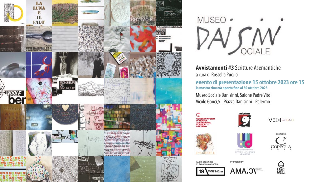 Domenica 15 ottobre a partire dalle ore 15:00 il rione palermitano di Danisinni (p.zza Danisinni / vicolo Ganci, 1) si anima con una serie di iniziative che accompagneranno l’apertura di Avvistamenti #3. Scritture Asemantiche a cura di Rossella Puccio, direttrice del Museo Sociale Danisinni; allestimento curato insieme a Stefania Licata. Una doppia inaugurazione dopo l’apertura del 7 ottobre per la XIX Giornata del Contemporaneo di Amaci - Associazione dei Musei d’Arte Contemporanea Italiani.