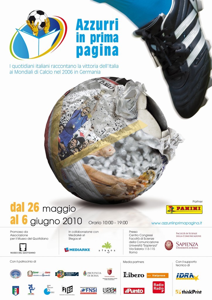 Si intitola “Azzurri in prima pagina” ed è un’originale mostra sulla vittoria dell’Italia ai Mondiali di Calcio in Germania del 2006. Vi saranno esposte le prime pagine originali di 80 quotidiani italiani che quattro anni fa celebrarono il successo della Nazionale nella finale di Berlino contro la Francia. La mostra sarà inaugurata mercoledì 26 maggio, alle ore 12, presso il Centro Congressi della Facoltà di Scienze della Comunicazione dell’Università “Sapienza” di Roma (via Salaria, 113-115). La partecipazione alla cerimonia inaugurale è aperta al pubblico.