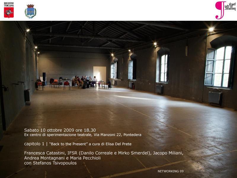 Sabato 10 ottobre a partire dalle ore 18.30, presso l’ex Centro di Sperimentazione Teatrale di Pontedera, gli artisti Francesca Catastini, IFSR (Mirko Smerdel e Danilo Correale), Jacopo Miliani, Andrea Montagnani, Maria Pecchioli, primo dei cinque gruppi di artisti toscani selezionati per la V edizione di Networking, a cura di Elisa Del Prete, incontrano il pubblico a conclusione dei lavori del workshop con Stefanos Tsivopolous.