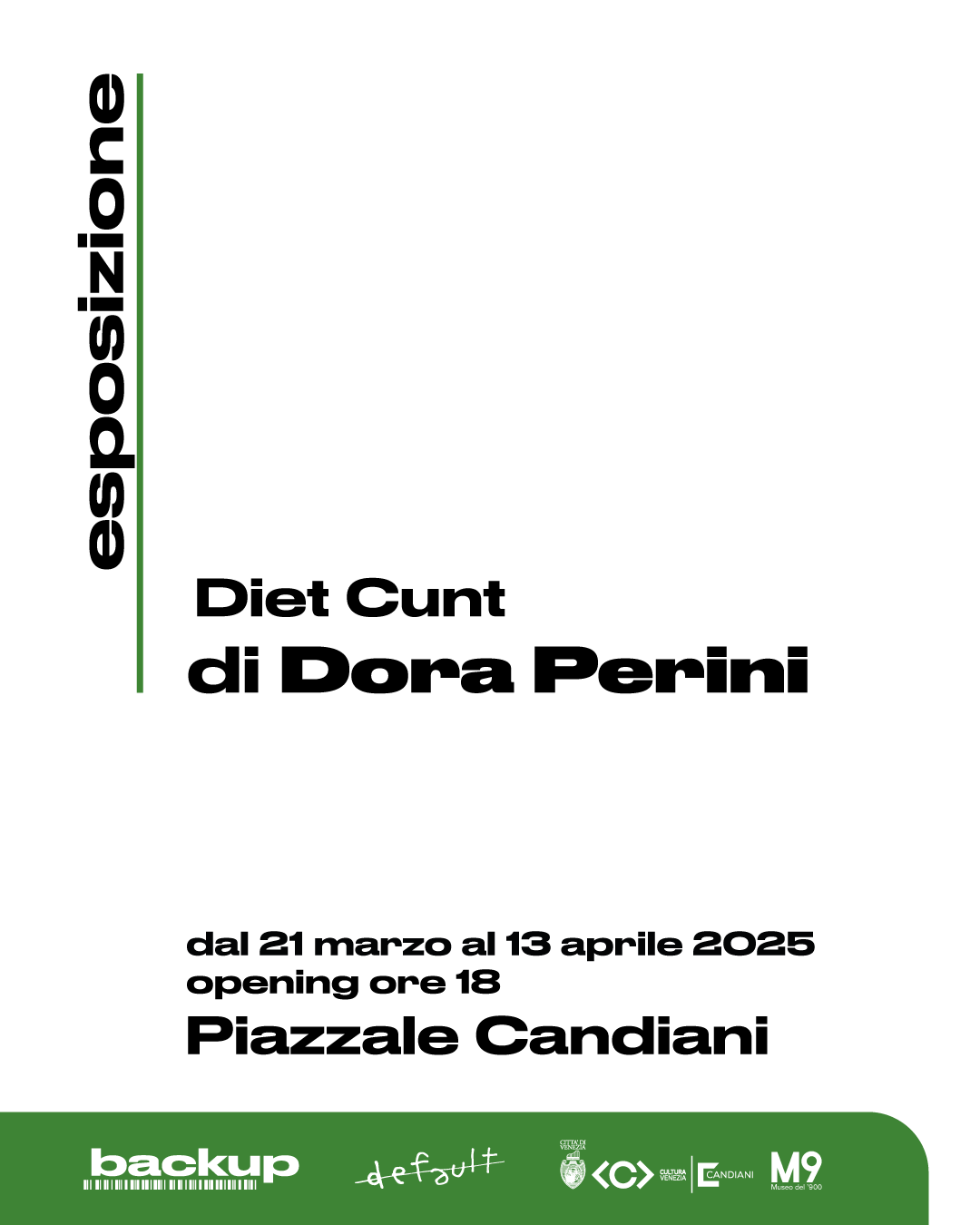 default propone backup, un progetto che si articola nello spazio urbano di Mestre, con l’obiettivo di archiviare la memoria e le identità contemporanee del territorio, distinguendo elementi significativi della cultura collettiva. Cinque artisti sono stati invitati a presentare interventi site-specific per le tre vetrine in Piazzale Candiani. Il progetto propone inoltre live set, performance e proiezioni tra l'auditorium del Centro Culturale Candiani e gli spazi di M9 - Museo del '900. L’azione urbana terminerà in autunno con una mostra collettiva dislocata, dove ulteriori artisti verranno invitati a contribuire.