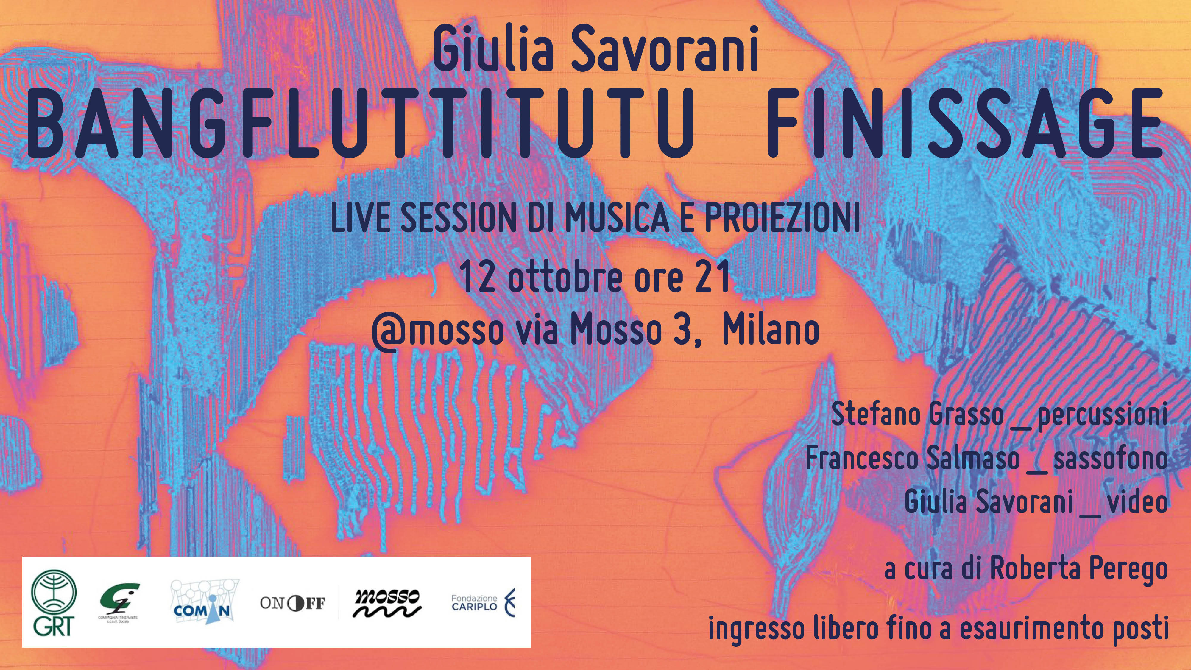 Il 12 ottobre la mostra “BANGFLUTTITUTU” di Giulia Savorani sarà visitabile dalle 17.00 alle 20.00 presso ONOFF, via Padova 94. L’evento conclusivo "BANGFLUTTITUTU FINISSAGE: live session di musica e proiezioni" è a partecipazione libera fino a esaurimento posti, presso la sala concerti di mosso, via Angelo Mosso 3, Milano. Sarà possibile usufruire del servizio bar all’interno della sala.