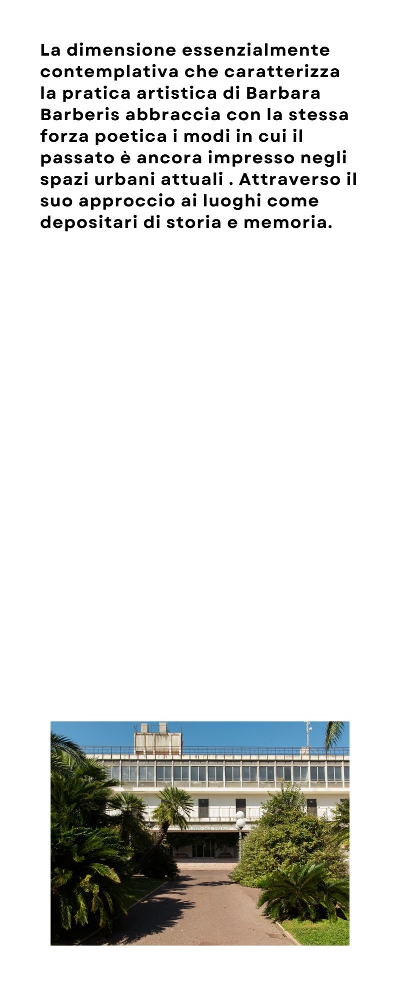 Tale approccio, nelle fotografie di Barbara Barberis, implica una riflessione profonda sul potere evocativo delle immagini. Le molteplici vicende individuali che nel tempo hanno contribuito a caratterizzare l’identità di un luogo, vengono infatti ricondotte, attraverso il linguaggio fotografico, nella fitta trama del reale odierno, tra le cui pieghe è possibile cogliere le stratificazioni di senso e di memoria prodotte dalla Storia.