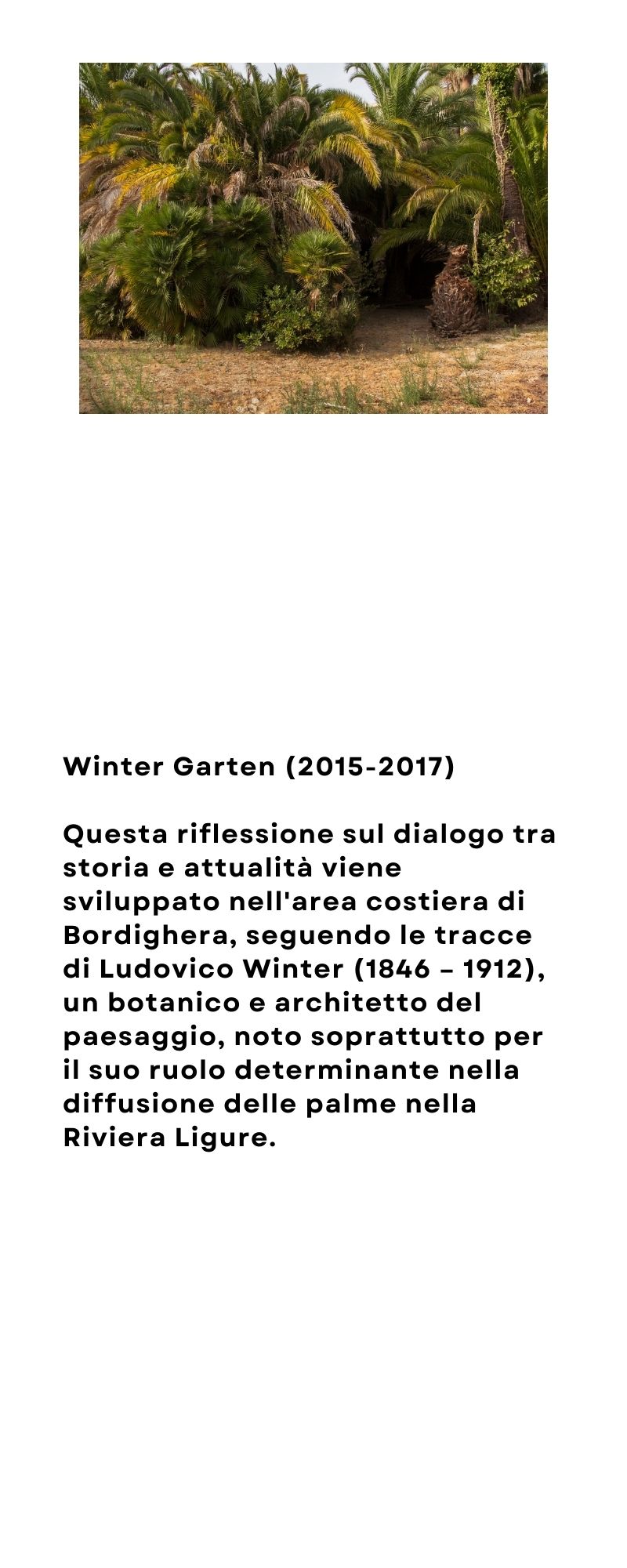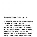 Nella serie Winter Garten (2015-2017) questa riflessione sul dialogo tra storia e attualità viene sviluppato nell'area costiera di Bordighera, seguendo le tracce di Ludovico Winter (1846 – 1912), un botanico e architetto del paesaggio, noto soprattutto per il suo ruolo determinante nella diffusione delle palme nella Riviera Ligure. Dopo essersi occupato per anni dei celebri Giardini Hanbury alla Mortola (Ventimiglia), tra il 1870 e il 1880 si specializzò nell’adattamento della costa rocciosa e dell’entroterra di Bordighera a diverse coltivazioni di specie esotiche (palme, cactacee, agavi e tante altre specie provenienti da terre remote), avviando un’intensa attività vivaistica che contribuì alla trasformazione dell’aspetto del paesaggio, sostituendo e integrando le colture agricole preesistenti.