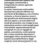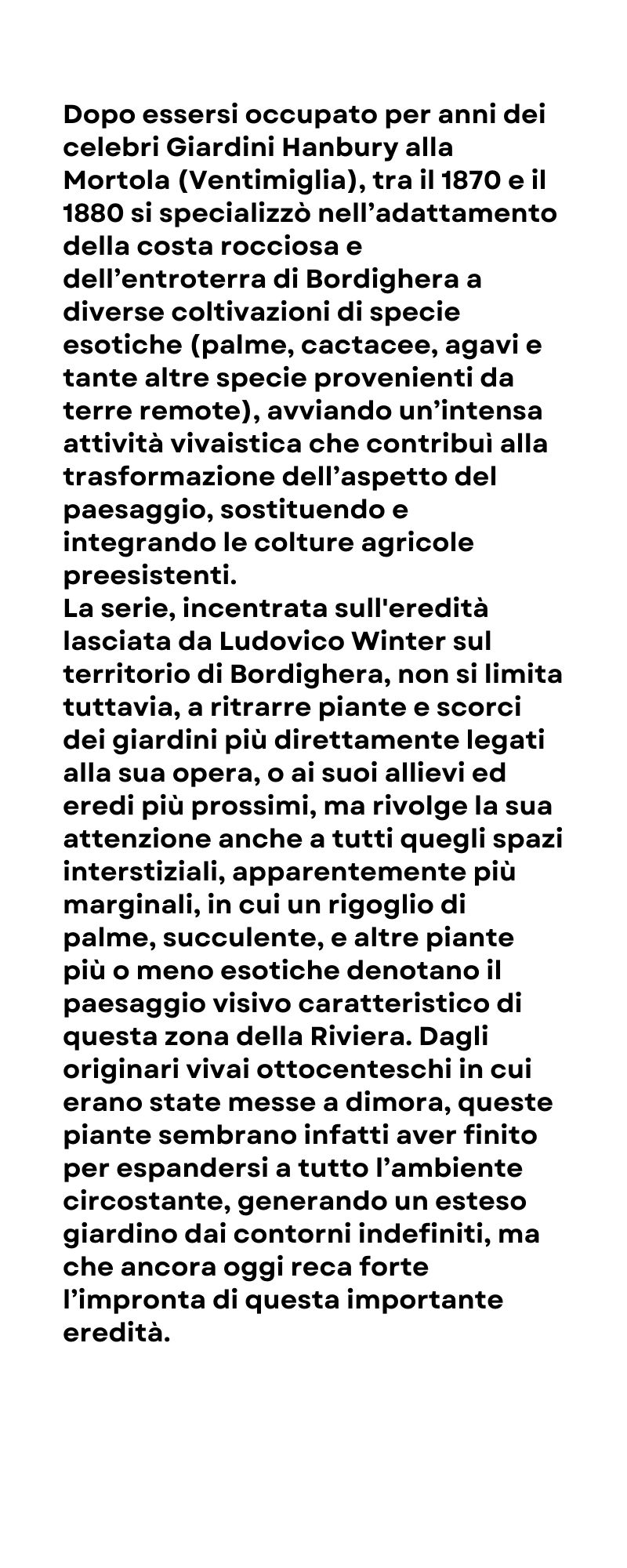 La serie, incentrata sull'eredità lasciata da Ludovico Winter sul territorio di Bordighera, non si limita tuttavia, a ritrarre piante e scorci dei giardini più direttamente legati alla sua opera, o ai suoi allievi ed eredi più prossimi, ma rivolge la sua attenzione anche a tutti quegli spazi interstiziali, apparentemente più marginali, in cui un rigoglio di palme, succulente, e altre piante più o meno esotiche denotano il paesaggio visivo caratteristico di questa zona della Riviera. Dagli originari vivai ottocenteschi in cui erano state messe a dimora, queste piante sembrano infatti aver finito per espandersi a tutto l’ambiente circostante, generando un esteso giardino dai contorni indefiniti, ma che ancora oggi reca forte l’impronta di questa importante eredità.