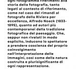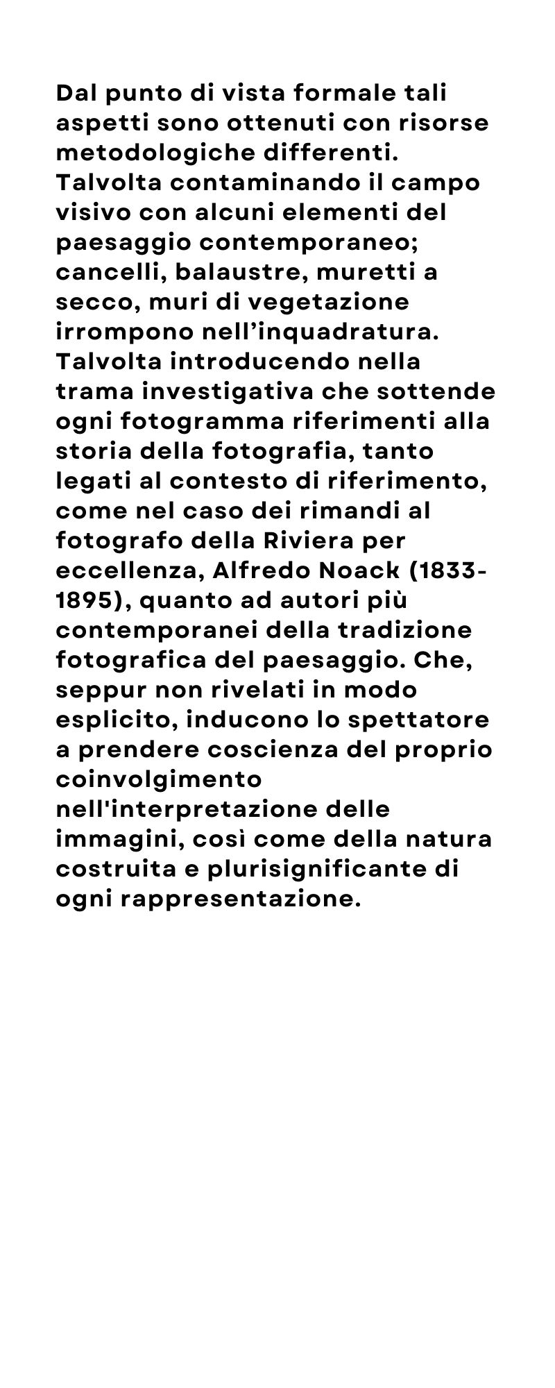 Dal punto di vista formale tali aspetti sono ottenuti con risorse metodologiche differenti. Talvolta contaminando il campo visivo con alcuni elementi del paesaggio contemporaneo, attraverso un ricco repertorio di cancelli, balaustre, muretti a secco, muri di vegetazione che irrompono nell’inquadratura. Talvolta introducendo nella trama investigativa che sottende ogni fotogramma riferimenti alla storia della fotografia, tanto legati al contesto di riferimento, come nel caso dei rimandi al fotografo della Riviera per eccellenza, Alfredo Noack (1833-1895), quanto ad autori più contemporanei della tradizione fotografica del paesaggio. Che, seppur non rivelati in modo esplicito, inducono lo spettatore a prendere coscienza del proprio coinvolgimento nell'interpretazione delle immagini, così come della natura costruita e plurisignificante di ogni rappresentazione.