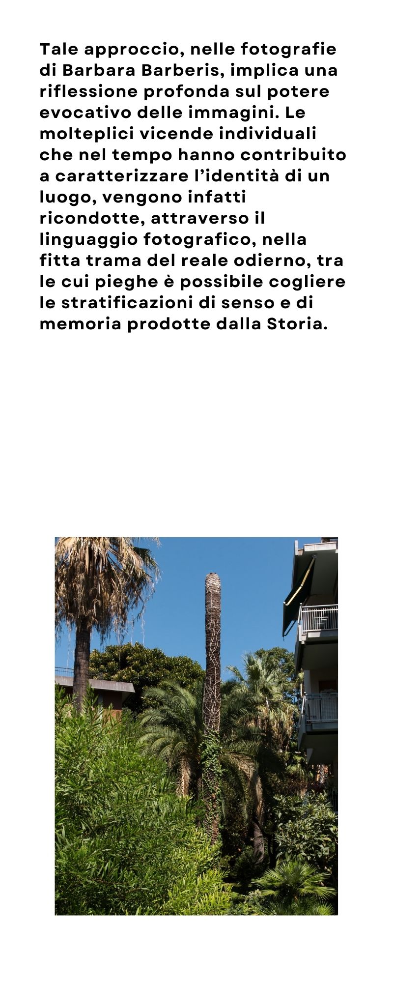La riflessione sul dialogo tra storia e memoria nella serie Winter Garten affronta come la città contemporanea gestisce e amministra la memoria storica. Sviluppato nell’area di Bordighera, Barbara Barberis ci mostra come le tracce del passato si sovrappongano ai tessuti urbani attuali.