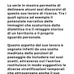 La serie in mostra permette di delineare alcuni assi discorsivi di questo suo lavoro di ricerca. Tra i quali spicca ad esempio il potenziale narrativo delle immagini che scaturisce dalla dialettica tra il retaggio storico di un territorio e il proprio sguardo personale.