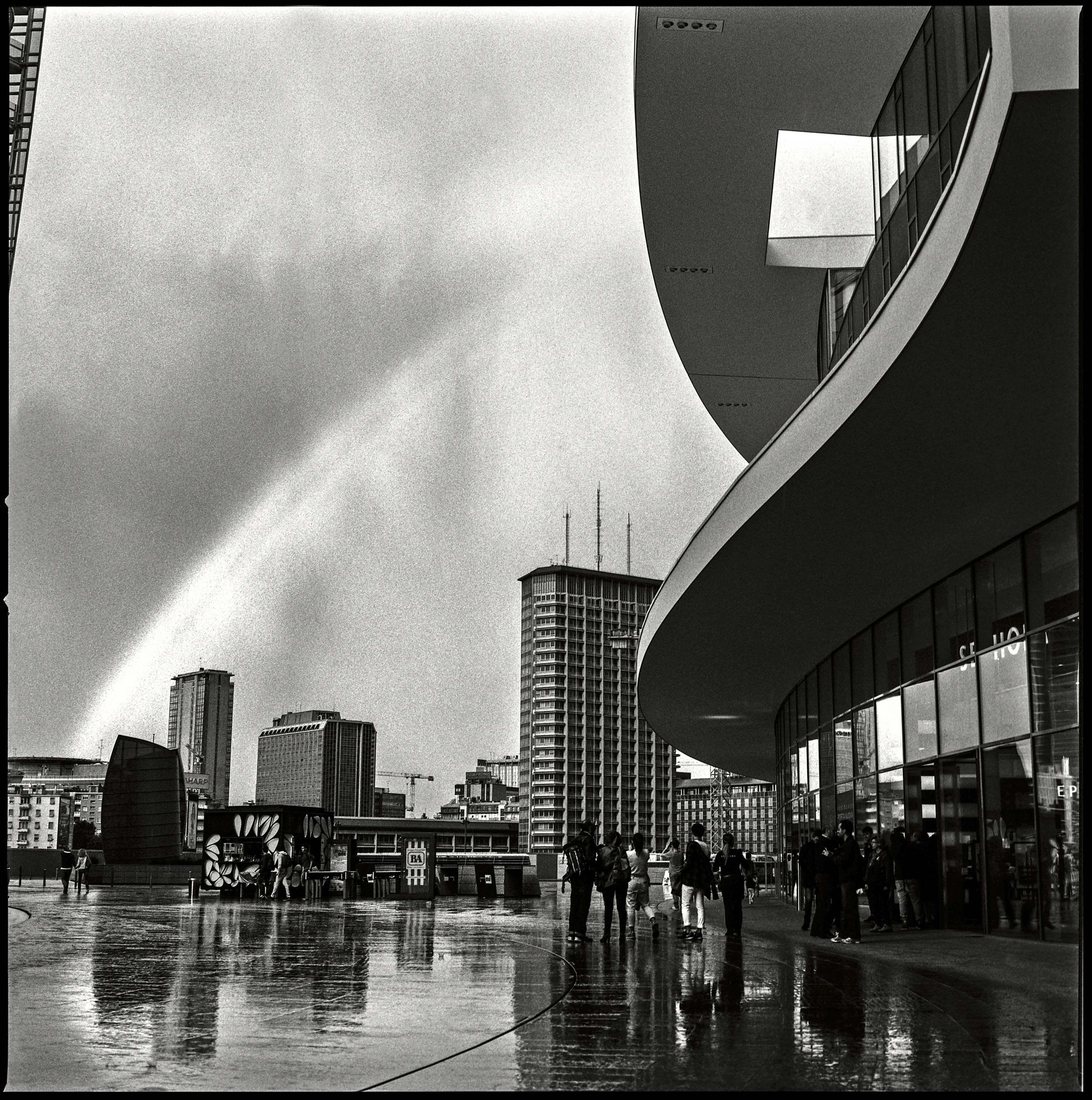 Zerodue è uno zero più una coppia, una dualità che simbolicamente ci rimanda ad una metropoli per sua natura ambigua, contraddittoria, unicamente costante nella sua doppia natura tellurica ed effimera. Le immagini diventano ambigue, perse in una doppia lettura tra l’istintivo e il ponderato, tra la vita che scorre veloce e la vita che si racconta. Sono immagini che parlano di cambiamenti e di trasformazioni, raccontano il movimento della città. Spesso caratterizzate dalla presenza di palazzi in costruzione, cantieri in opera, strade e ponti in cambiamento, linee e prospettive profonde, tempi di posa lunghi, sono immagini mai ferme, perché Milano non è mai ferma, non è mai la stessa. Questa città fatta di novità e movimento è rappresentata utilizzando un bianco e nero denso, contrastato, a volte cupo, magari con una luce filtrata da un cielo grigio pieno di pioggia.