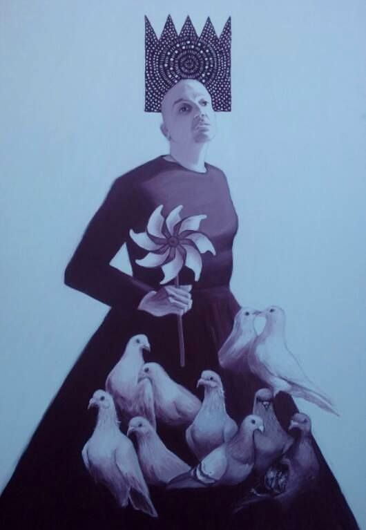 Le opere esposte vedranno altri due elementi ricorrenti: la corona e la girandola. La corona diviene il simbolo della potenza interiore, mentre la girandola, quello della fanciullezza e dell’innocenza, rappresentando anche un mezzo per affrontare con leggerezza le difficoltà della vita e per ritornare un po’ bambini. Evocatrice di leggerezza e movimento la girandola diviene ne Il Trionfo della pace anche il simbolo della serenità. L’artista utilizza colori caldi ed avvolgenti. Le tele sono essenzialmente tricromatiche, realizzate con l’utilizzo del marrone, del viola e del bianco. Il marrone, colore dell’artigianato e della natura, rappresenta la vitalità intesa come equilibrio tra corpo e mente; il viola aumenta il mistero e la magia delle sue opere; il bianco, invece, oltre a conferire luminosità, indica la purezza e la spiritualità del processo creativo.