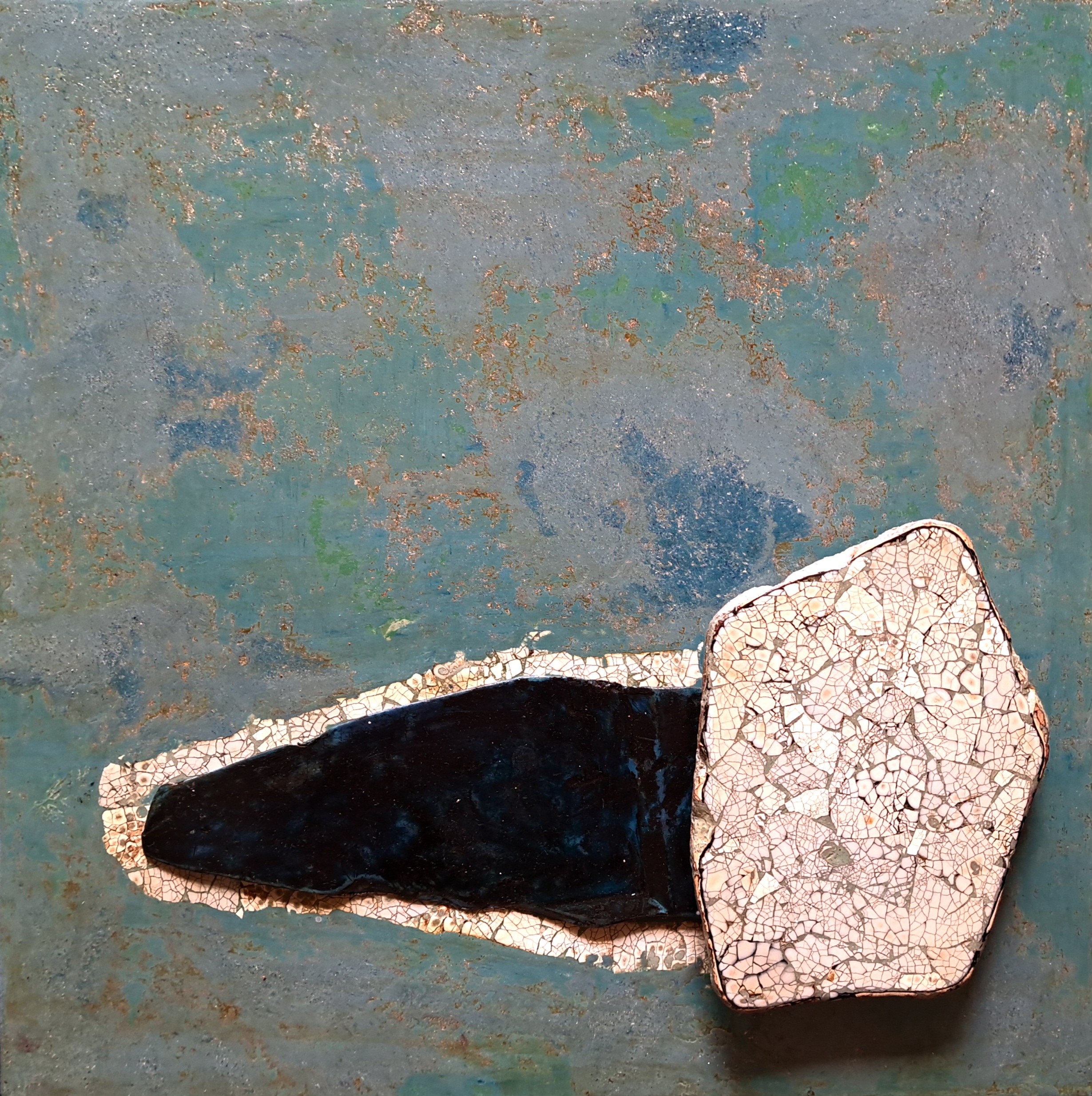 Se la tecnica richiama l’estremo oriente, l’ispirazione affonda nel mare, nella sua ambivalenza primordiale: forza che consuma e che conserva, che travolge e che trasforma. Le superfici delle opere di Pellizzari raccontano orizzonti marini astratti, tracce di marea, paesaggi interiori sedimentati nella memoria. Le crettature e le abrasioni richiamano l’azione erosiva dell’acqua, ma anche quella della luce, del vento, del tempo.