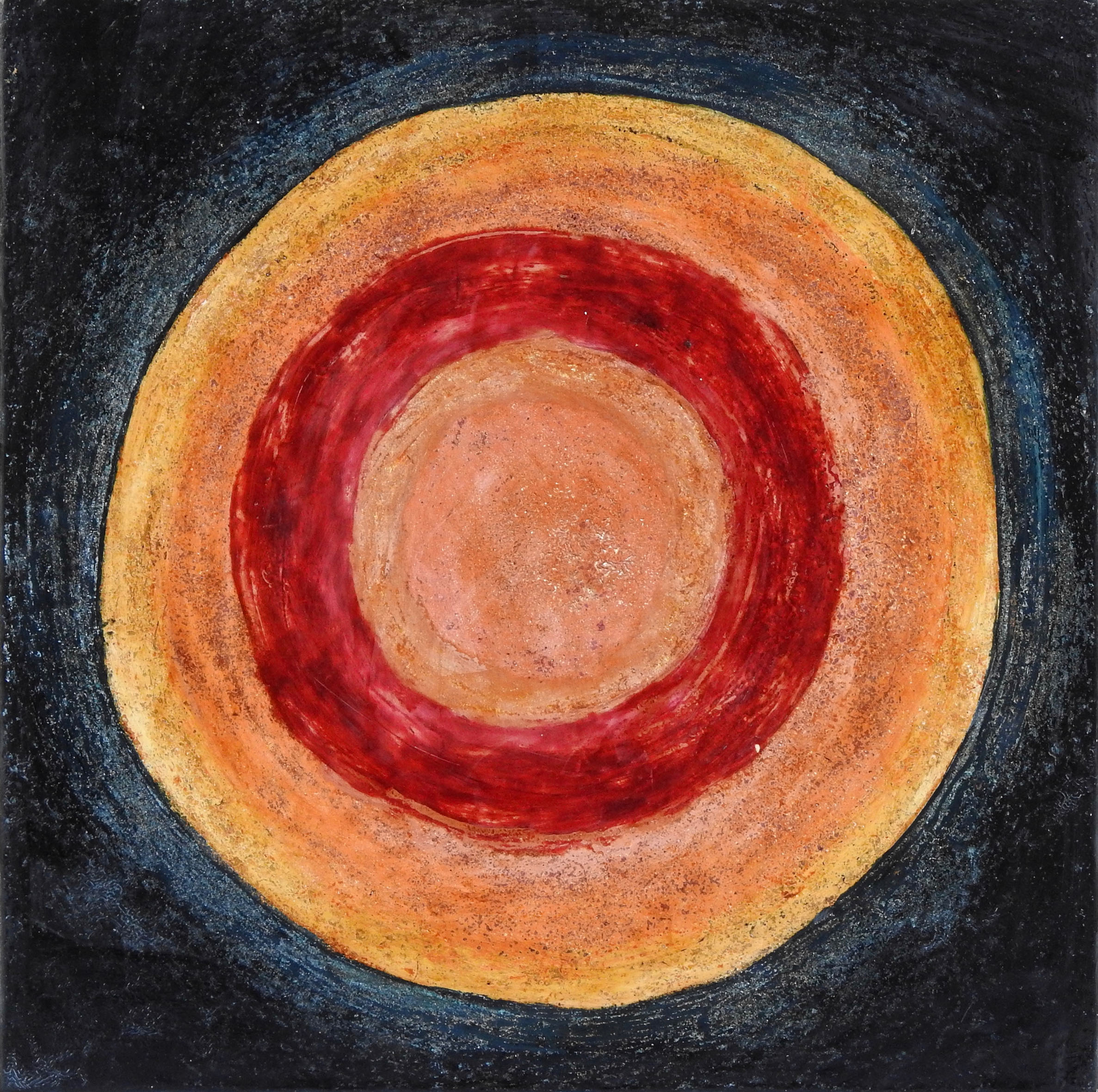 I lavori esposti, tutti realizzati su pannelli di masonite, che talvolta l’artista cosparge con gusci d’uovo, nascono dall’attenta stratificazione di resina pura alternata a una miscela di resina, foglie d’argento o d’oro e pigmenti colorati. In una ricercata e continua operazione di sottrazione e addizione, che caratterizza questa peculiare fase creativa, l’artista lava e scartavetra la superficie facendo riemergere elementi dagli strati sottostanti e aggiunge, nei punti desiderati, nuovo colore, metalli e resina. Interviene infine con l’inserimento di elementi dipinti ad olio; il risultato è una superficie setosa, che invita il visitatore alla scoperta della dimensione tattile dell’opera.