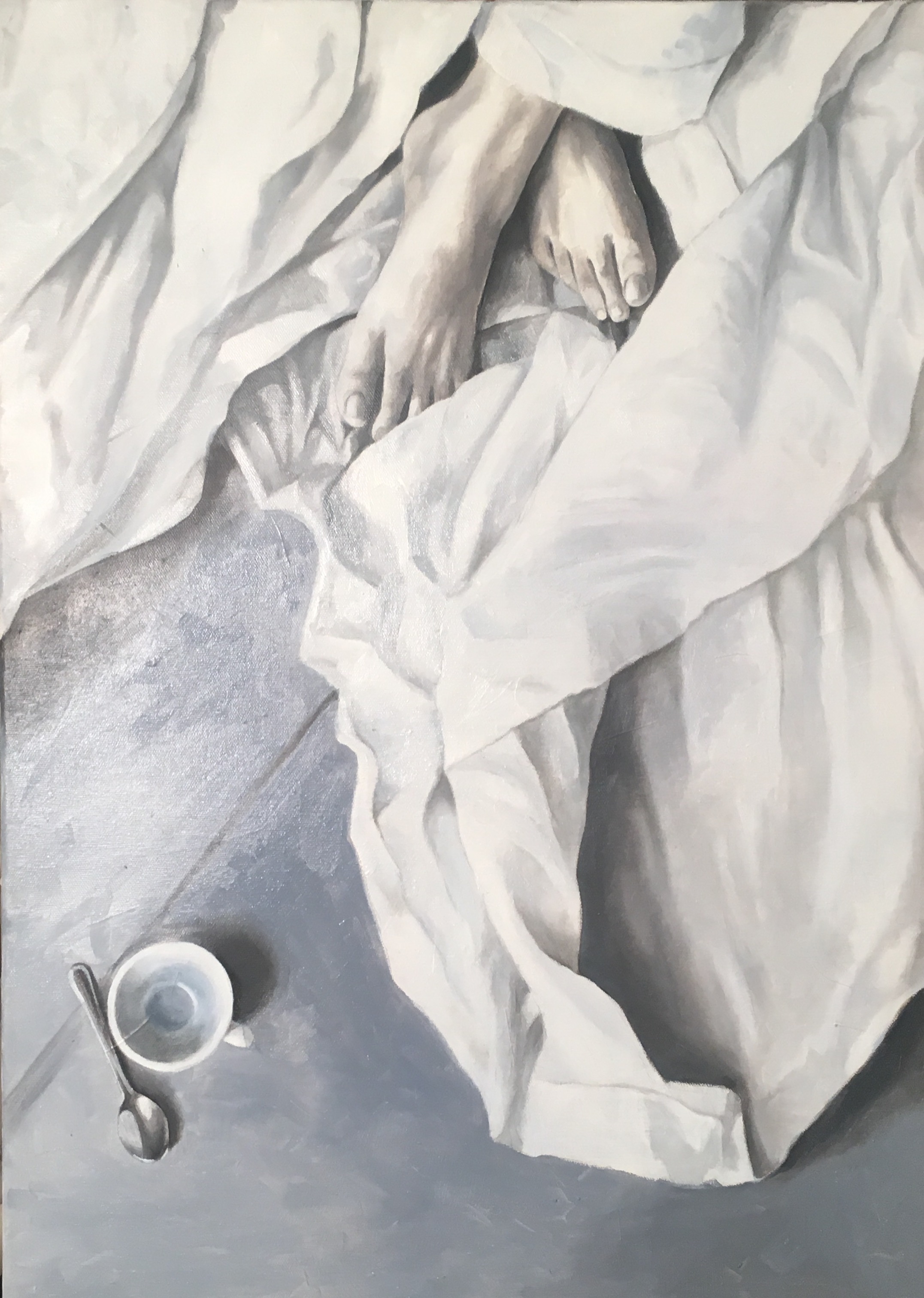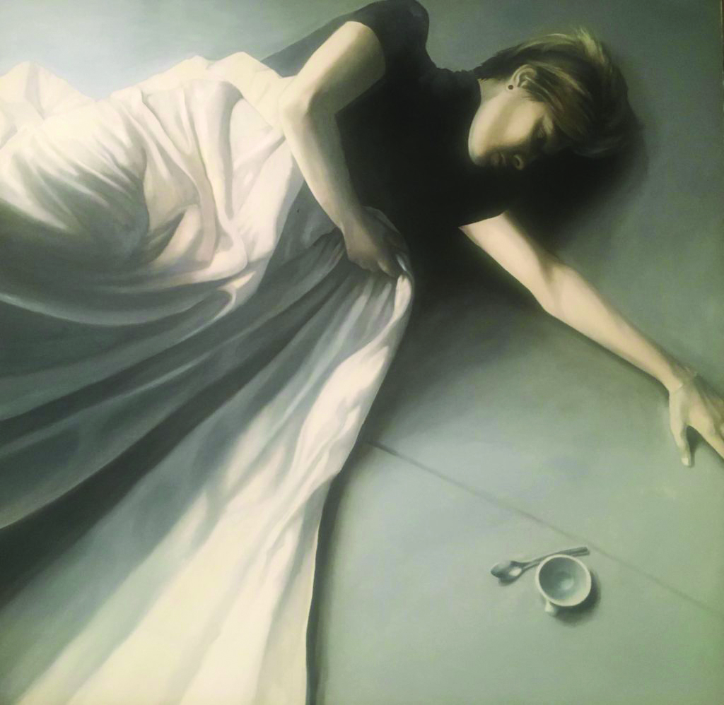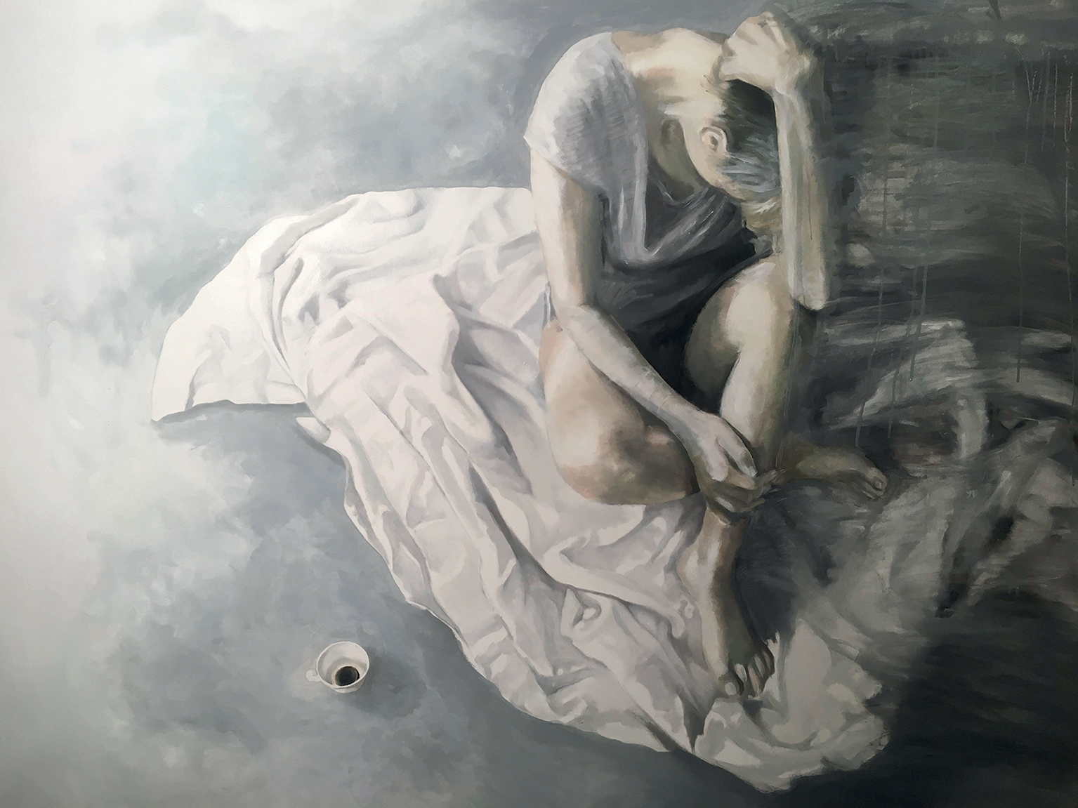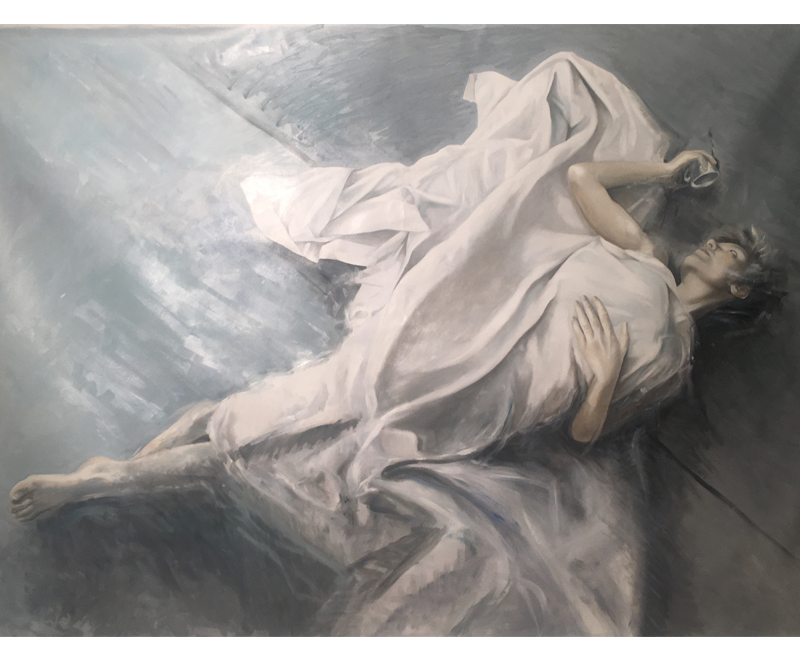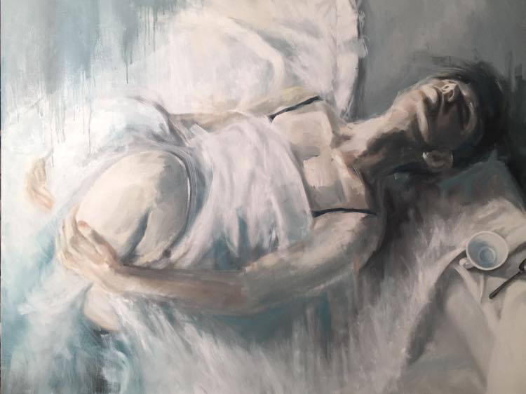 Il visitatore potrà addentrarsi nelle tele di Pietrasanta che ritraggono in prevalenza figure femminili, avvolte in lenzuola mentre si svegliano dal sonno, distese su pavimenti monocromi e accompagnate dalla presenza di una tazzina di caffè che le accompagna, come tonico irrinunciabile, nella realtà del mondo. I colori tenui e le pose estatiche, le rivelano come colte nell’ attimo fuggente del qui e ora”, situazione che mette in forte relazione emotiva l’opera con lo spettatore.