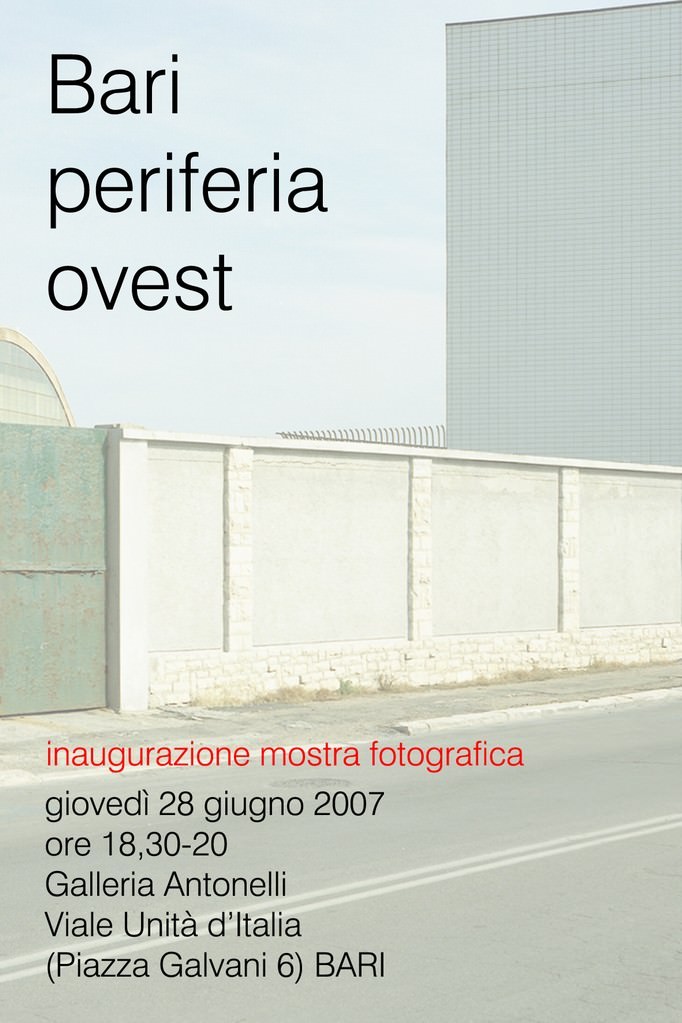 La mostra presenta una settantina di scatti, a colori e in bianco e nero, frutto dell'indagine svolta dai partecipanti al secondo Laboratorio di Fotografia dell'Architettura e del Territorio, organizzato presso il Politecnico di Bari. Ancora una volta, studenti del Politecnico sono stati chiamati a praticare quella insistenza dello sguardo, quella dubbiosa interrogazione dei dati del reale alla quale faceva riferimento Paolo Costantini, applicandola questa volta al terrain vague della periferia barese a Ovest della parte centrale della città.