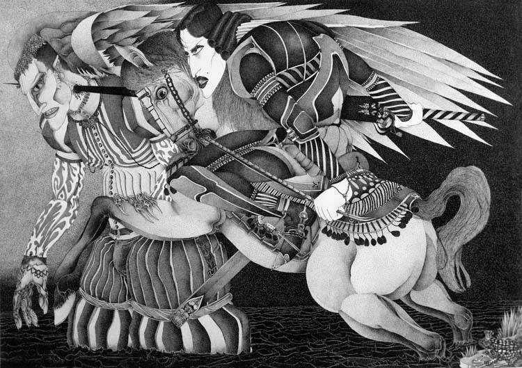 Una selezione di opere, inchiostro su carta, di un giovane artista. Una decina di quadri di grandi dimensioni in cui l’artista, attraverso la tecnica del puntinismo e l’uso del neutro, raffigura angeli, guerrieri, personaggi irreali, con un costante richiamo al gotico, al fumetto ed alla modernità.