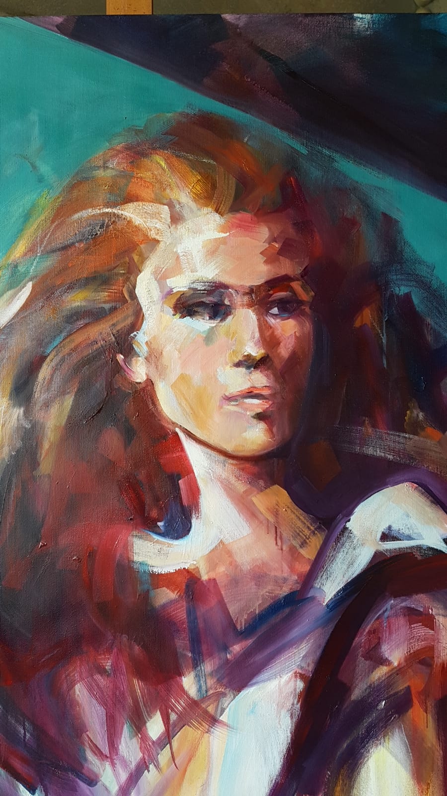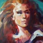 La Tortorelli, invece, affronta la pittura e la figurazione con una verve empatica, non è un’artista qualunque, non è l’appassionata d’arte che disegna tutto ciò che vede, nelle figure spesso femminili, lei va oltre, mostra sguardi intimi segno di una passione innata. In questa esposizione, per la prima volta, c’è un protagonista di spalle al mondo:l’atteggiamento raccolto e la posa lasciano intendere riflessione e meditazione, segno di attesa in un fondo blu dalle pennellate fugaci. Nell’arte della Tortorelli, ‘non c’è differenza’ tra astrazione e figurazione perché è proprio su di una soglia che si sviluppa l‘intera creazione, tra una pittura rapida e non finita e l’esplosione avvincente dei cromatismi. L’arte della Tortorelli dice tutto nei tratti e in quei dettagli che paiono assenti, ma che solo lo sguardo attento e scrupoloso riesce a cogliere..