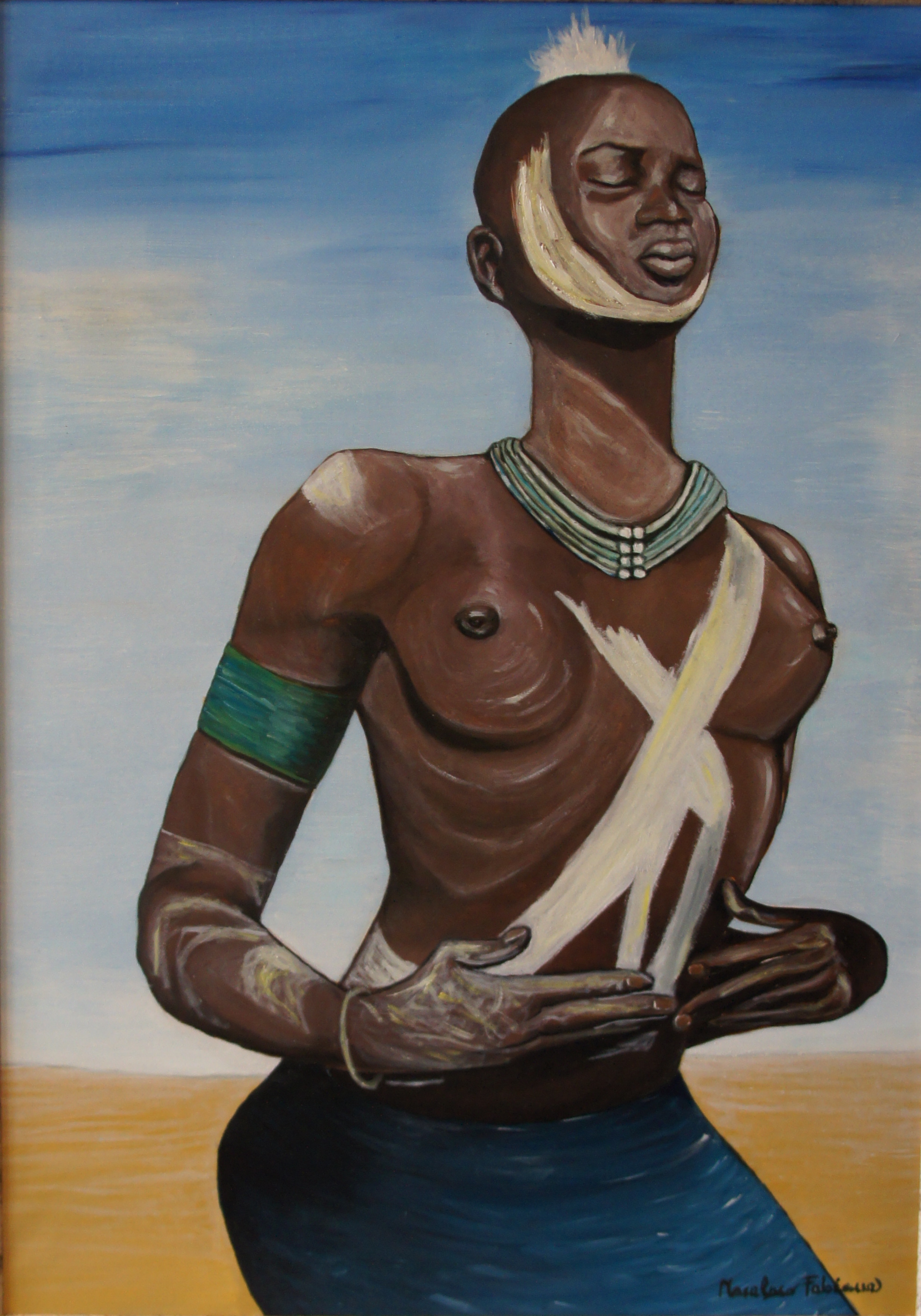 Fabiana Macaluso è ispirata da suoi viaggi per figurazioni importanti ed intriganti. Dalla Polinesia ha imparato a conoscere la luce ed è per questo che nelle sue opere si ritrova la ‘luce bianca’, quell’ accecante bagliore che emerge dai fondi e che rende speciali diverse creazioni rendendole leggere e leggiadre insieme. I personaggi sono persone incontrate e viste durante viaggi e questo rende le opere non fini a se stesse, ma oggetti di studio per molti, conoscenza di altri mondi e oggetto di formazione. I colori utilizzati rispecchiano la realtà attraverso contrasti che lasciano grandi segni ed è per questo che pare di leggere negli occhi dei personaggi, studiare attraverso le pose e immergersi nei mondi che ogni fondo delinea. Una pittura che non è basata su fotografia, ma che nasce dagli scatti mentali della Macaluso ed è proprio dall’elaborazione in studio che si trova l’essenza, poiché è con la contemplazione mentale che l’artista stende con diligenza l’olio sulla tela lasciando che la creazione divenga momento fondamentale rispetto al risultato. Un’arte che non ha dettagli, decorazioni minute, ombre, ed è in questo risiede la grandezza poiché ogni tratto è ricolmo di uno spirito generatore che lascia chiavi di lettura individuali rendendo quasi mitica l’immagine rappresentata.