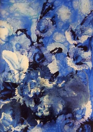 Il blu della serenità, della calma, della soddisfazione, si congiunge – soprattutto nella forma floreale – al bianco della purezza, mentre altre cromie tipo il viola (che del resto è l’unione proprio tra il blu ed il rosso), completa quei magici contenuti dell’uno e dell’altro supporto telaceo, su cui in qualche caso troviamo l’accentuazione del suo “spirito felice” tramite l’apposizione di sottilissime lamine a foglia d’oro. Spruzzi di sole accanto ai quali, come nel sentiero della fantasia, sbocciano le rose rosse della vitalità, attorniate dai verdi decisi e resistenti.”