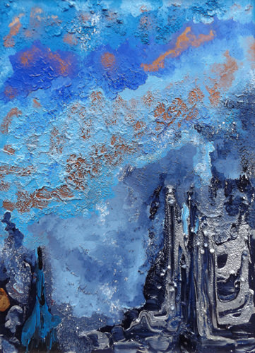 Beatrice Santucci ci prende per mano, poi ci abbraccia e infine culla e conforta i dubbi umanissimi del nostro limite, li distilla nei colori che, complici, non si annullano mai, come i sentimenti umani. I neri si fondono con i rossi, tra gli arancioni, i gialli mimosa, i blu. Blu mai freddi, mai sospesi. Blu invece del Cielo, dell’Aria, dello Spirito, della Vita.