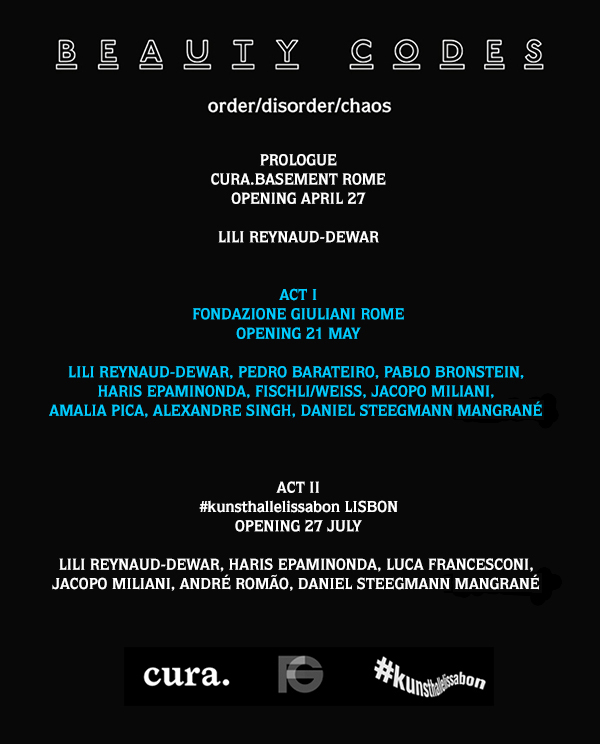 La mostra Beauty Codes (order/disorder/chaos) nasce dal lavoro congiunto di tre spazi internazionali, CURA., Fondazione Giuliani e #kunsthallelissabon e si sviluppa nell’arco di sei mesi in tre tappe successive.