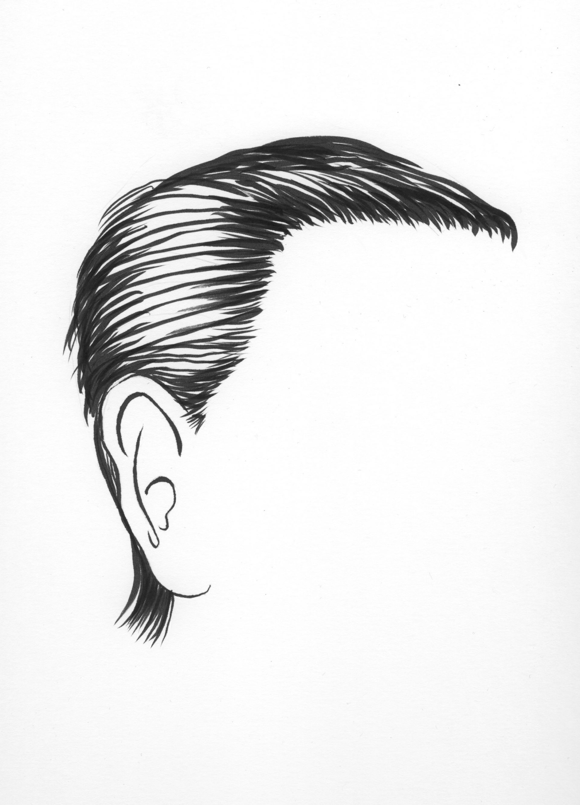 His hair has been slicked back so that the pale skin of his scalp highlights the shape of his hairline. He had never taken drugs with his hair slicked back before.