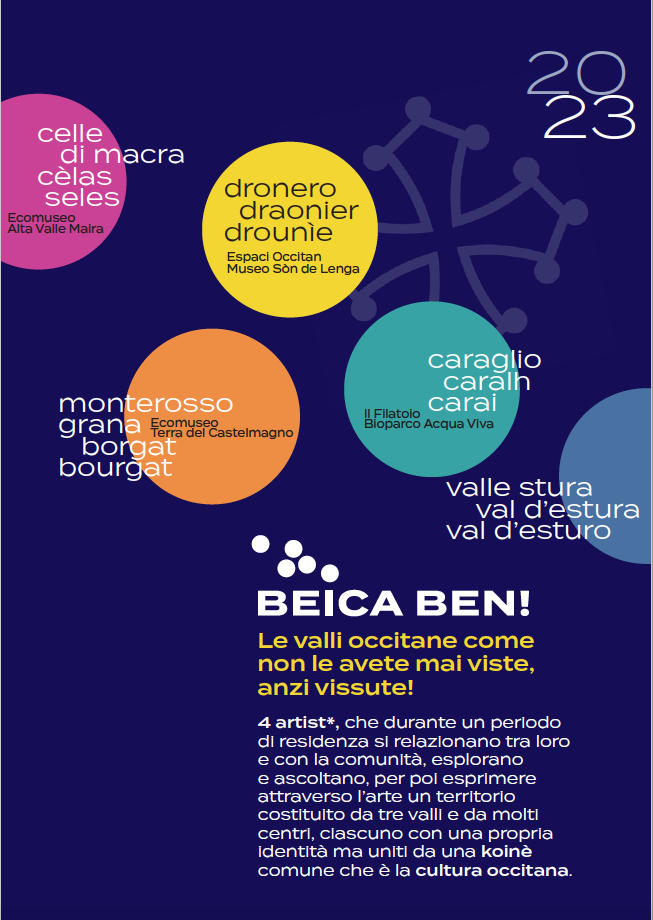 Dal 29 settembre al 1° ottobre, saranno inaugurate le opere realizzate durante le residenze artistiche della seconda edizione del progetto Beica Ben!, svoltesi tra il 29 maggio e il 1° giugno 2023. I quattro artisti invitati si sono relazionati tra loro; hanno esplorato i territori con le loro tradizioni, cultura e folklore, confrontandosi con le comunità locali; hanno tradotto, con codici contemporanei, il lascito ancora vivo della cultura occitana. Maura Banfo racchiude in manifesti, disseminati tra Roccasparvera, Moiola e Gaiola, le storie orali della valle Stura, ricche di parole ed immagini; Manuela Cirino ritraccia il dialogo antichissimo tra cielo e terra nel suo progetto all’Ecomuseo Terra del Castelmagno, in località San Pietro, a Monterosso Grana; Silvia Margaria disegna un’installazione tra fantasia popolare e ambiente, che si fa percorso, tra il Filatoio e il Bioparco “Acqua Viva” di Caraglio; infine, Enrico Tealdi che - ispirato dal patrimonio pittorico delle cappelle affrescate della val Maira - ritrae un omaggio femminile universale, all’Espaci Occitan a Dronero.