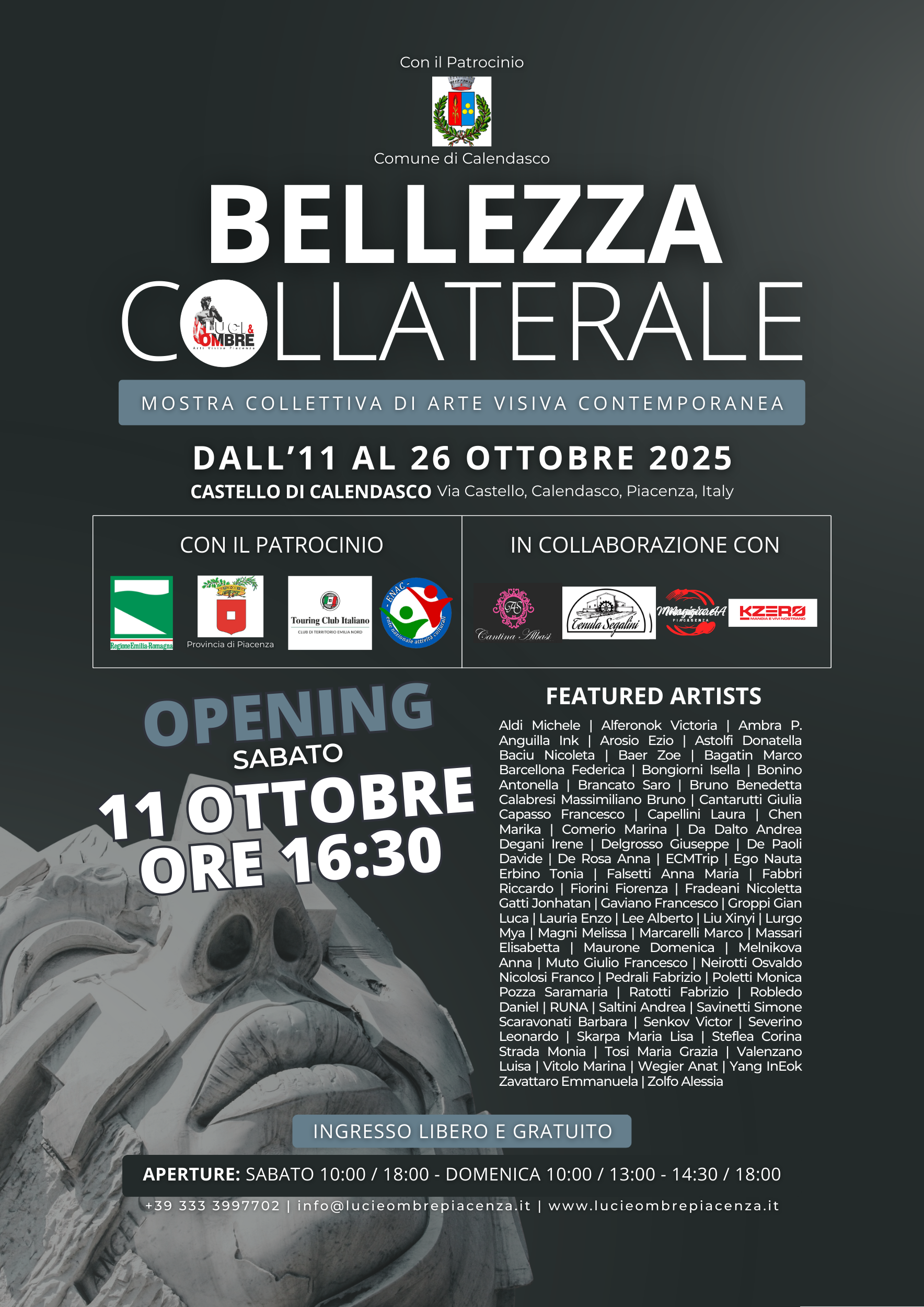 Con “Bellezza Collaterale”, l’Associazione Luci & Ombre conferma la propria missione: valorizzare artisti e opere contemporanee in un contesto di grande fascino storico, trasformando Calendasco e la provincia di Piacenza in un polo di turismo culturale e di riflessione condivisa.
