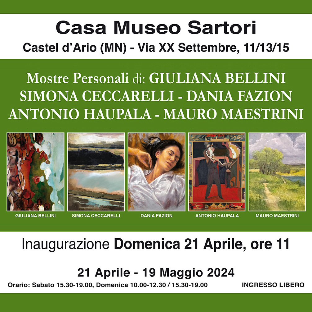 La Casa Museo Sartori di Castel d’Ario (MN), in via XX Settembre 11/13/15, ha organizzato le mostre personali degli artisti Giuliana Bellini, Simona Ceccarelli, Dania Fazion, Antonio Haupala, Mauro Maestrini che saranno aperte al pubblico da domenica 21 Aprile a domenica 19 Maggio 2024.