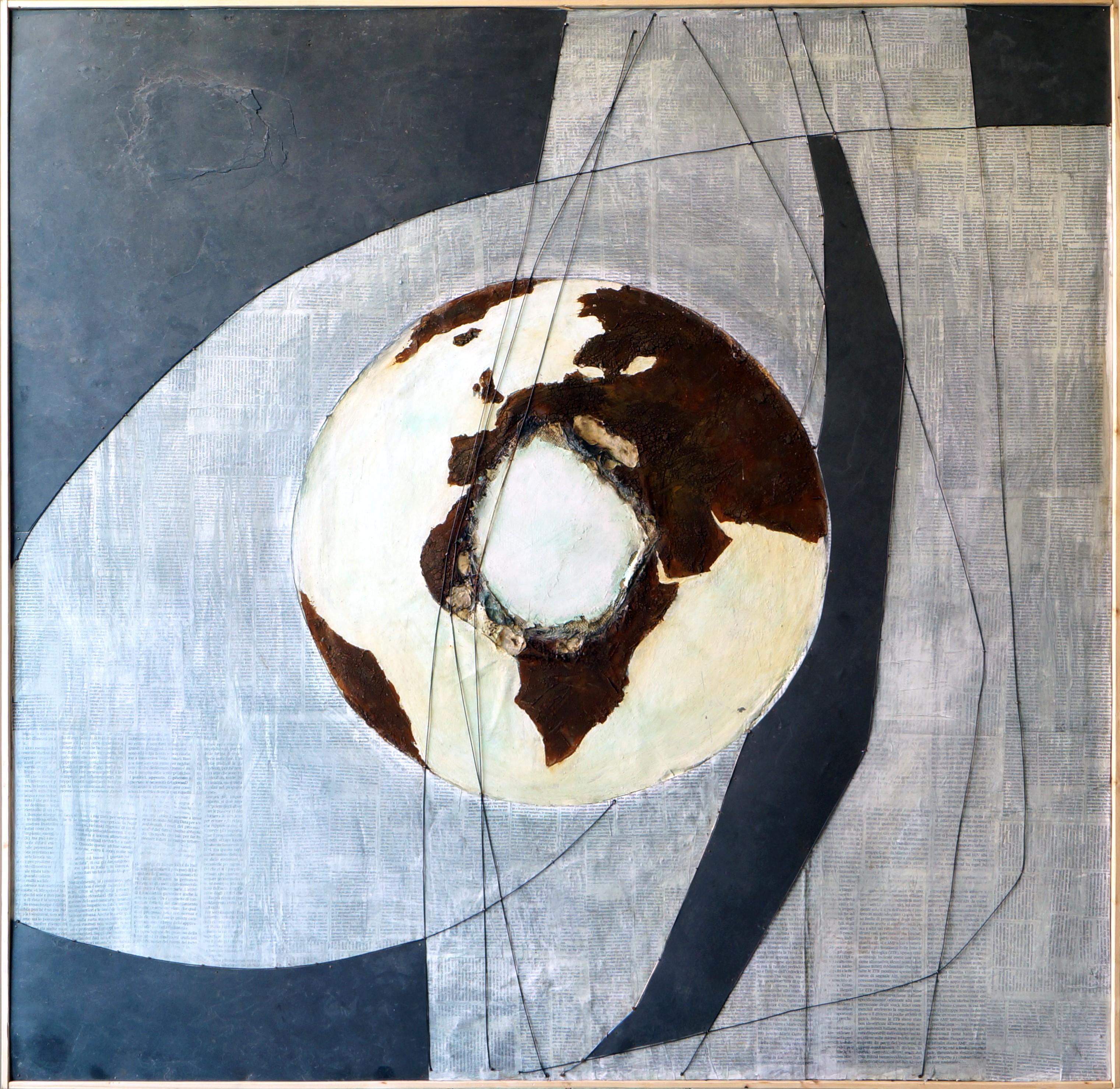 Nelle opere “Abitare la terra” Pietro Panza ha sperimentato la relazione tra arte natura e tecnica in una “terra incognita planetaria” con la quale ci dobbiamo riconcettualizzare anche in chiave etica-antropologica. Lo è per Homo Fictus, un animale che racconta storie condividendo memorie ed immaginazione, il quale si pone nella sfera della cultura dove ciò che è natura è esente dalla contaminazione umana. In questo tempo di tardo antropocene le due cose sono indissolubilmente intrecciate e dobbiamo immaginare, sconfinare e (proprio come i nostri antenati) trovare qualcosa oltre all’assoluto del paradigma in vigore, affinché non si determini un collasso. Una nuova narrazione fuori dal self che ci permetta di uscire dalla prospettiva limitata d’un io individuale, non solo per entrare in altri io simili al nostro ma per fare parlare ciò che non ha parola, l’uccello che si posa sulla grondaia, l’albero in primavera e l’albero in autunno, la pietra, il cemento, la plastica …