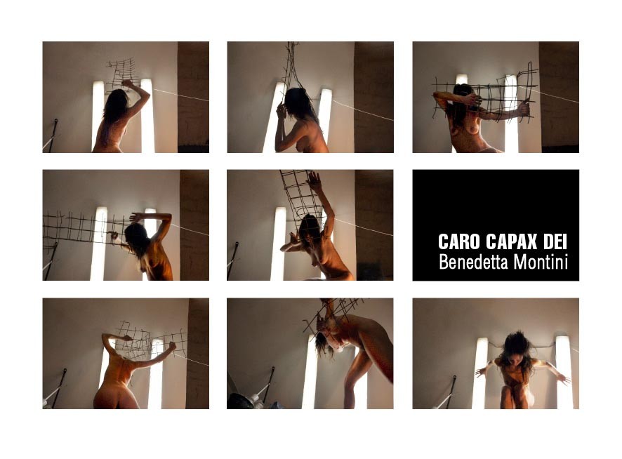 L’artista intraprende un gioco-lotta con il controluce dei neon, attraverso uno sforzo del corpo tenta di superare la clausura dell’ambiente sotterraneo che assorbe il gesto e riempie la campitura fotografica, limitandone l’impresa . Benedetta Montini con la serie di fotografie CARO CAPAX DEI , intende fare un omaggio a Francesca Woodman, utilizzandone il linguaggio dell’autoscatto al quale sottrae la luce naturale, elemento chiave degli scatti della fotografa americana, per lavorare sul concetto scultoreo del “non finito” in Michelangelo.