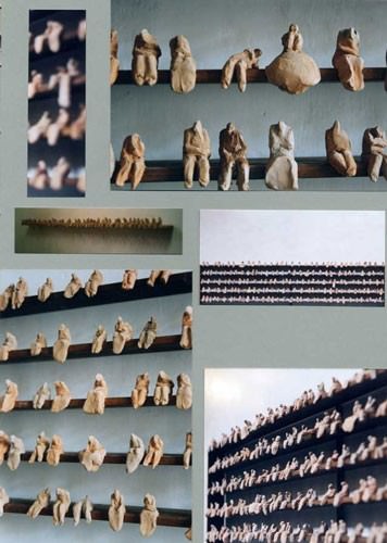 Carlo D’Oria gioca con la figura umana nelle posture rituali del quotidiano. Un percorso intelligente e raffinato, fatto di sculture che sono il concentrato catalizzante di una storia plausibile. Come nel caso di questa spiazzante libreria che domina la vetrina sulla piazza. Una serie di piani paralleli su cui sono sedute decine di figure in terracotta: ora piegate, ora più vigili, ora stanche, amalgamate assieme da un “abito” che rende la molteplicità una massa uniforme. L’opera diventa così una gradinata di spettatori muti, un osservatorio che scruta la piazza e sembra interrogare lo sguardo dei passanti. Al confine tra Tadeusz Kantor e Christian Boltanski, D’Oria realizza un’installazione dove si concentrano storie, delusioni, amori, passioni. Una libreria della vita, un raccoglitore di memorie e vitalità. Un posto dove aleggiano i fantasmi e le ombre della nostra storia interiore.