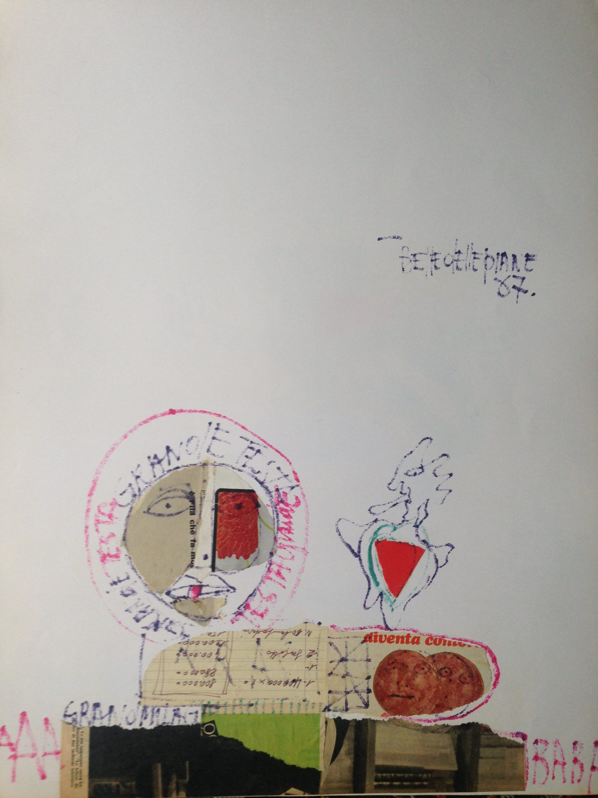 Intanto, i suoi collages le sue “figure” spiritose, raffinati lavori su carta, che nascono magicamente da ritagli, lettere, numeri e tratti di pennarello, ci fanno compagnia