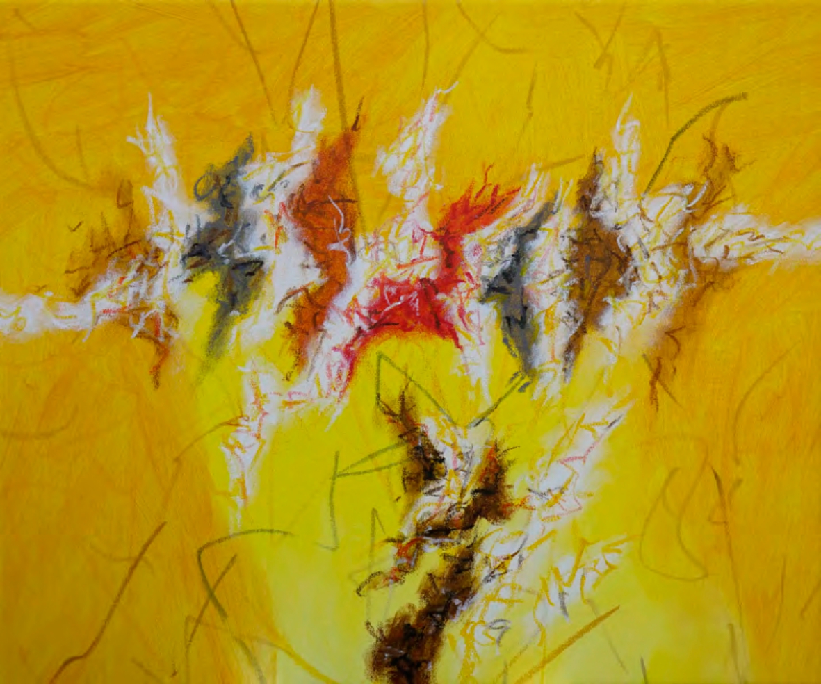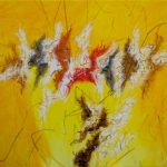 Beppe Schiavetta riesce a intrappolare una vibrazione tridimensionale in uno spazio bidimensionale dove le forme sono frantumate dall’energia dei segni che, idealmente travalicano e invadono lo spazio e l’ambiente circostante con un movimento senza tregua in un moto vorticoso dal ritmo inebriante.