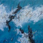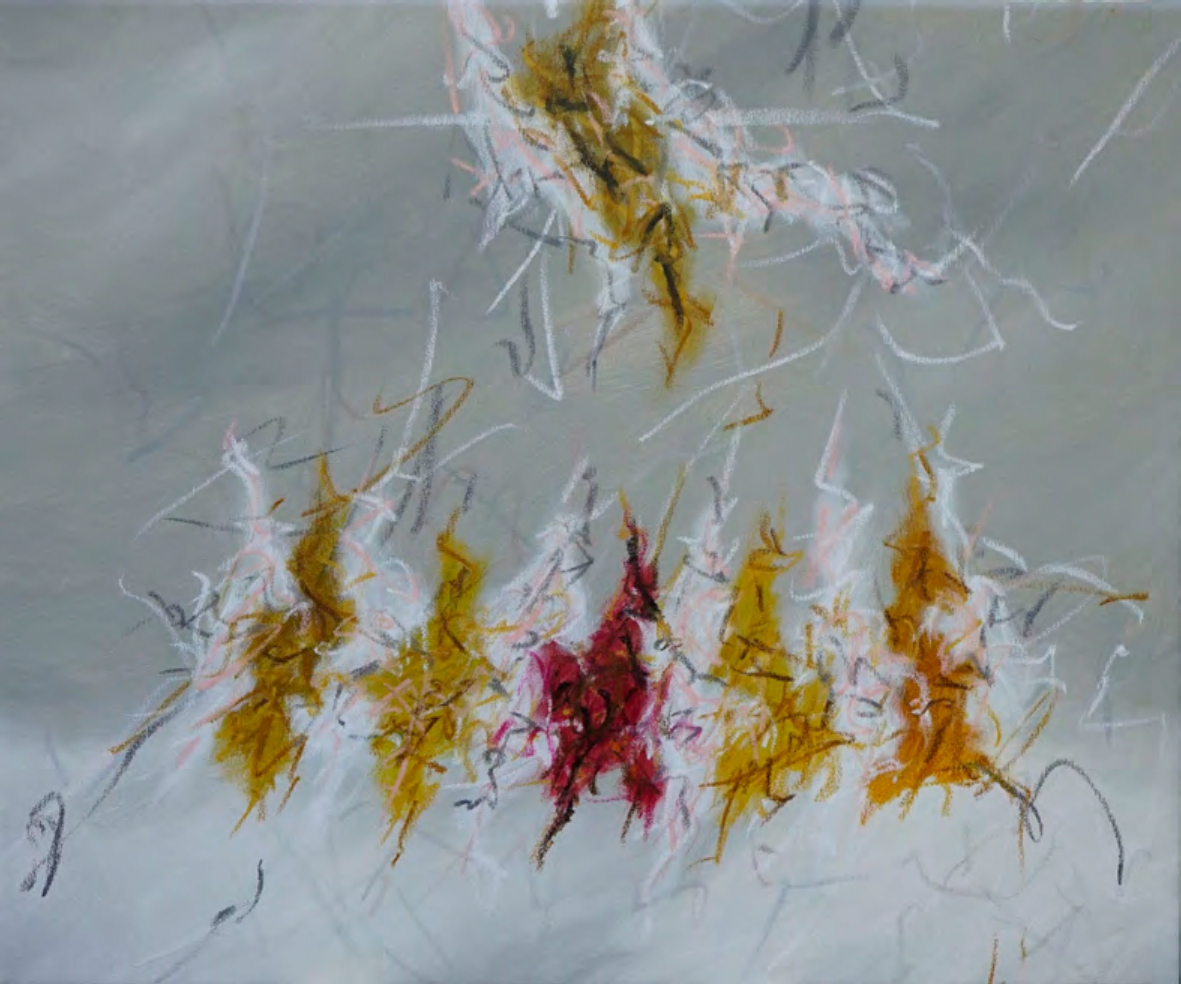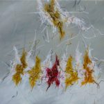 I dipinti attuali appaiono come un frammento di spazio zoomato e ingrandito a dismisura in modo da colmare completamente la superficie del supporto, un piano orizzontale in cui si svolge un movimento frenetico, un moto senza tregua di segni e colori dal significato inafferrabile, una dissipazione che vaga libera nello spazio del supporto e che idealmente, come nei lavori di alcuni anni fa, si propaga nell’ambiente circostante.