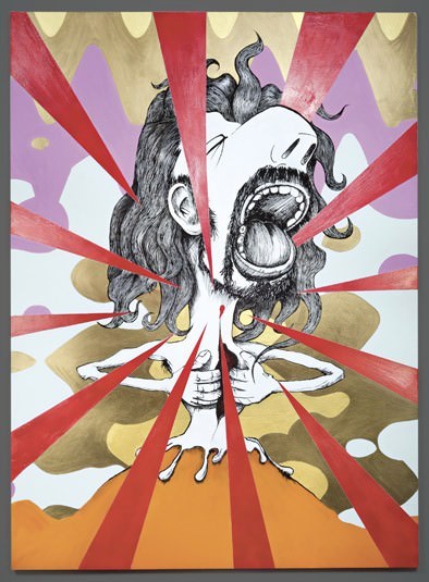 Forme oniriche e psichedeliche che attraversano la mente dell’artista e che in un Urlo auto-biografico si liberano squarciandogli il petto.Ma su tele e tavole di legno,quelle Interferenze Mentali,ritornano nelle mani dell’artista che le riporta alla superficie riempiendole di colore e materia.