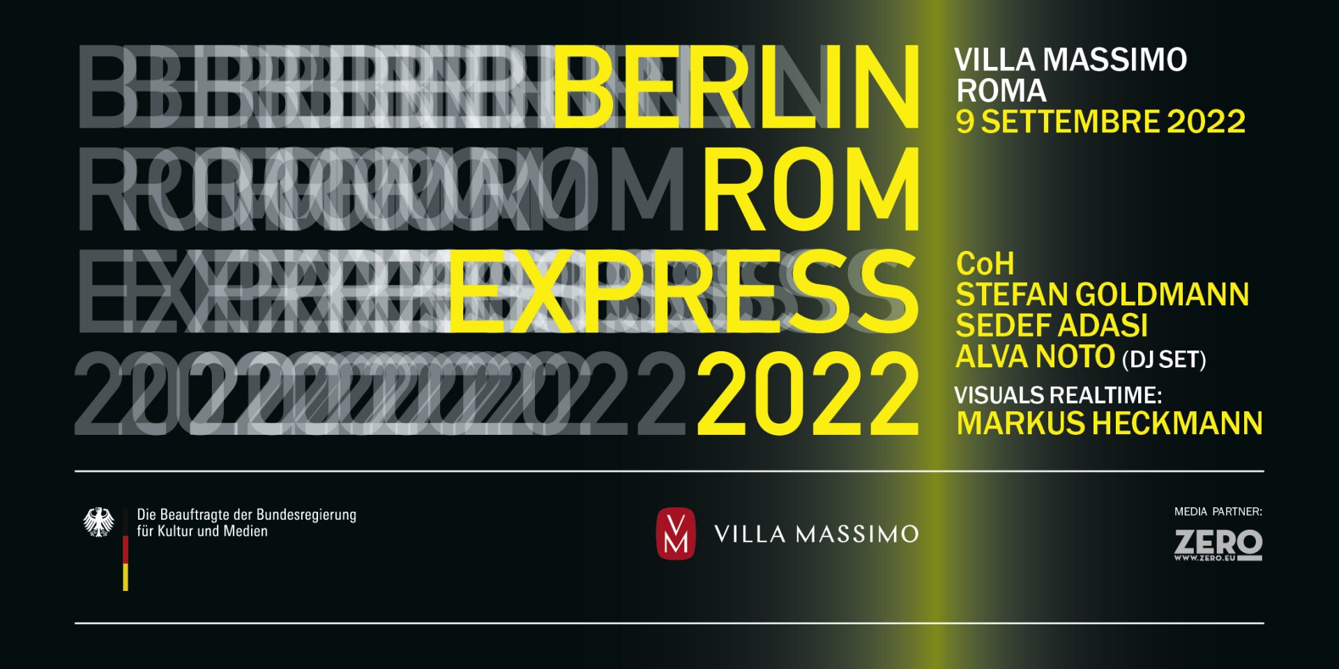 All’Accademia Tedesca Roma Villa Massimo, venerdì 9 settembre 2022, alle ore 20.00, si tiene la quinta edizione di BERLIN ROM EXPRESS. André Jürgens e Carsten Nicolai aka Alva Noto, curatori artistici, per l’occasione hanno invitato ad esibirsi dal vivo CoH, Stefan Goldmann e in prima assoluta in Italia Sedef Adasi. Le performance avranno il contributo dei visual realtime di Markus Heckmann. La serata prevede anche un dj-set di Alva Noto.