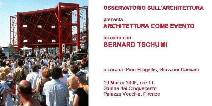 Sarà Bernard Tschumi ad aprire il ciclo di incontri per la stagione 2005 dell’Osservatorio sull’Architettura, l’iniziativa promossa dalla Fondazione Targetti con il contributo dell’Assessorato all’Urbanistica del Comune di Firenze.