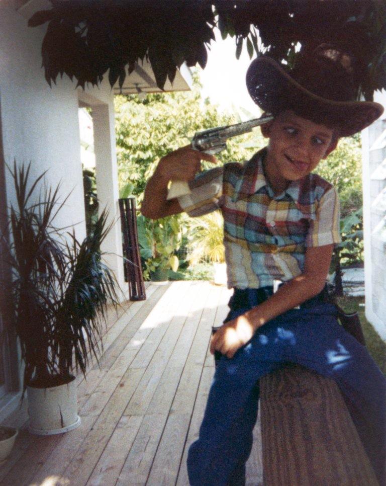 Lo spettatore entra nella stanza della galleria dove incontra una grande parete di neon raffigurante il profilo di uno stereotipato tramonto di film western e la fotografia incorniciata dell'artista da bambino