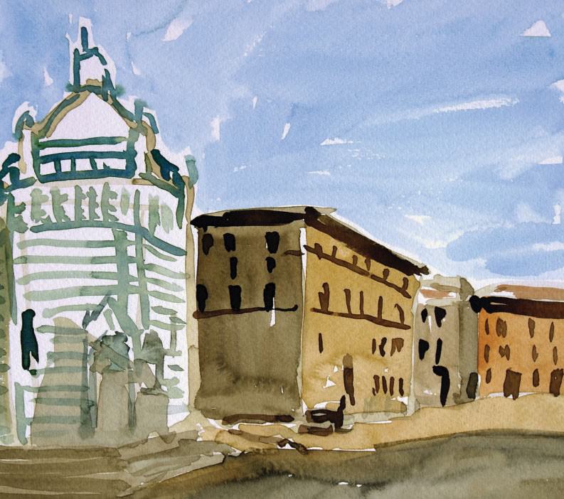 Bert Welmers, architetto e urbanista olandese, collaboratore del noto architetto concittadino Adolfo Natalini, è anche un valido pittore e, dal momento che apprezza il nostro Paese, come molti di coloro che dal nord scendono al sud per effettuare il mitico Viaggio in Italia non ha potuto smentire la tradizione è ha realizzato un numero considerevole di vivaci “impressioni” utilizzando la tecnica canonica dell'acquerello usata per fissare l'istante atmosferico e l'emozione. Di fronte al paesaggio, alle piazze, a un monastero, a una villa, al corso di un fiume, del suo peregrinare di regione in regione, Bert Welmers ha annotato figurativamente un proprio diario personale che diverge, in senso positivo, rispetto alle ricognizioni convenzionali pur eccellenti sul piano tecnico. Tali esperienze infatti (dal '700 in poi gli esempi sono numerosi), sono volte in maniera preminente alla registrazione “fotografica” del reale e quindi, risultano più prove documentarie o fedeli resoconti di quanto visto. Al contrario, il vedutismo di Welmers, affatto analitico e descrittivo, si stempera in delicate emozionalità, in cadenze formali ritmate da luci e ombre mai impositive e contrastanti; piuttosto si rarefanno in trasparenti fluidità e l'insieme risulta la memoria larvale di un attimo, di una felicità vissuta in rapporto con la storia e con la natura. Inoltre le piazze, le emblematiche piazze italiane (su tutte quella di Siena e di Roma, ma non poteva mancare la nostra piazza del Duomo) si presentano con le loro architetture rappresentate per lo più in prospettiva fortemente inclinata (a quadro obliquo) e il risultato è sorprendente: infatti divengono leggere e la loro tensione vettoriale suggerisce, metaforicamente, l'ipotetico “desiderio” di distaccarsi dal terreno, di abbandonare la loro sede per andarsene insieme all'artista che, congiuntamente, desidera portarle con sé.
