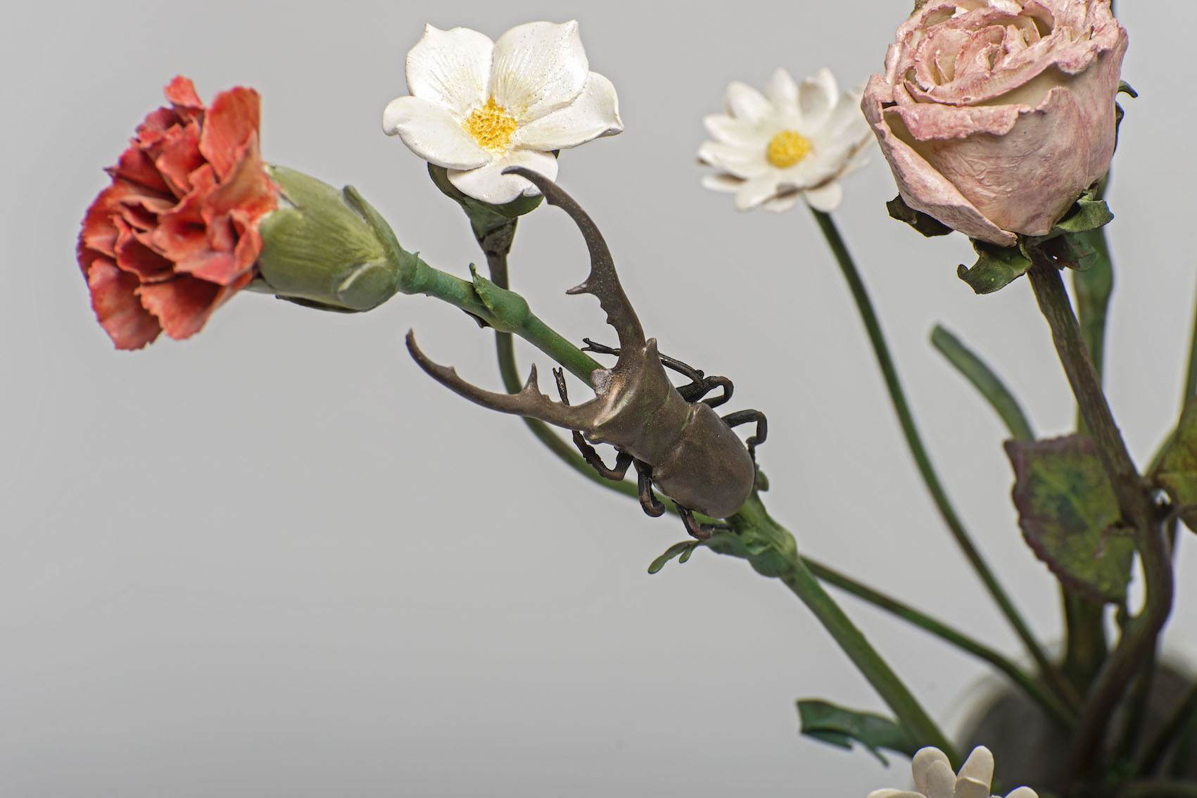 “Cosa resta di un suono dopo che è stato ascoltato? Cosa resta di un’immagine quando chiudiamo gli occhi? La realtà non è mai univoca, non è solo ciò che appare, ma anche ciò che rimane nascosto, ciò che la nostra mente, il nostro cuore e la nostra esperienza permettono di vedere”. Questa la riflessione di Raffaele Quattrone, cui si deve la curatela del racconto contemporaneo, realizzato in collaborazione con Athena Antichità. Pugliese, classe 1974 e bolognese d’adozione, Quattrone racconta che: “le sculture di Bertozzi & Casoni non sono semplici rappresentazioni della natura: fiori di ceramica che non sbocciano, custodie di violino che non contengono suono, vasi che non custodiscono più il tempo della materia. Ogni opera è un enigma che gioca con la nostra percezione e con i nostri sensi, suggerendo che ciò che vediamo è solo un frammento della realtà, un'illusione, un'ombra di qualcosa che va oltre il visibile. La visione non è solo un atto fisico: è intessuta di esperienze, emozioni, memorie. Guardiamo il mondo con gli occhi della nostra storia, dei nostri desideri, delle nostre paure. Le opere ci sfidano a chiedere: cosa vediamo davvero? Cos’è che ci sfugge? Un fiore non è solo un fiore, una custodia di violino non è solo un contenitore. Sono riflessi di qualcosa che esiste solo nella nostra percezione”.