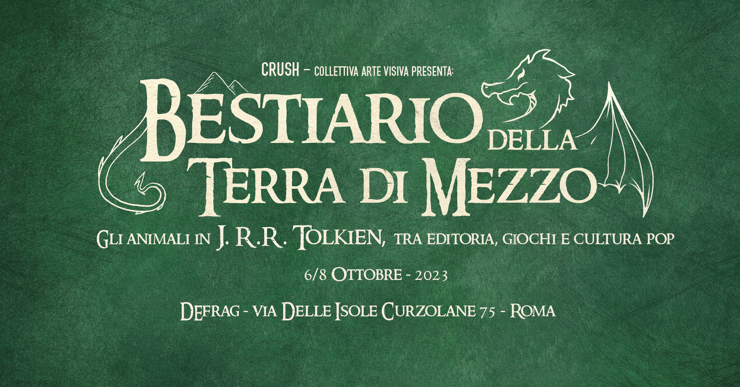 CRUSH - Collettiva Arte Visiva, in collaborazione con AIST - Associazione Italiana Studi Tolkieniani e con l'associazione Defrag, presenta Bestiario della Terra di Mezzo, mostra collettiva curata da Eleonora D’Agostino, antropologa le cui ricerche si sono concentrate sugli aspetti socio-politici degli immaginari fantastici e della cultura pop, e Matteo Gabos, artista, grafico e musicista attivo da anni nel panorama romano.